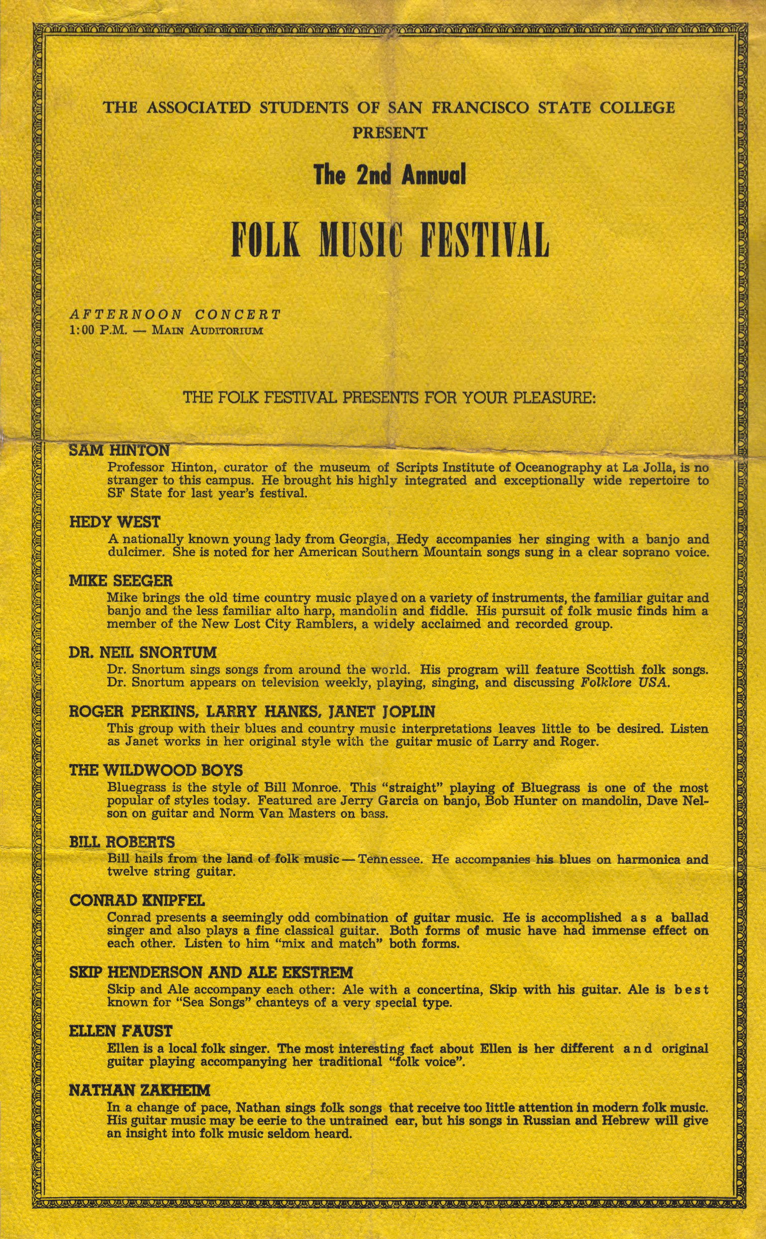 This event was the 2nd annual SF State Folk Festival, produced by Rodney Albin. This performnace was duirng the afternoon show that began at 1pm.