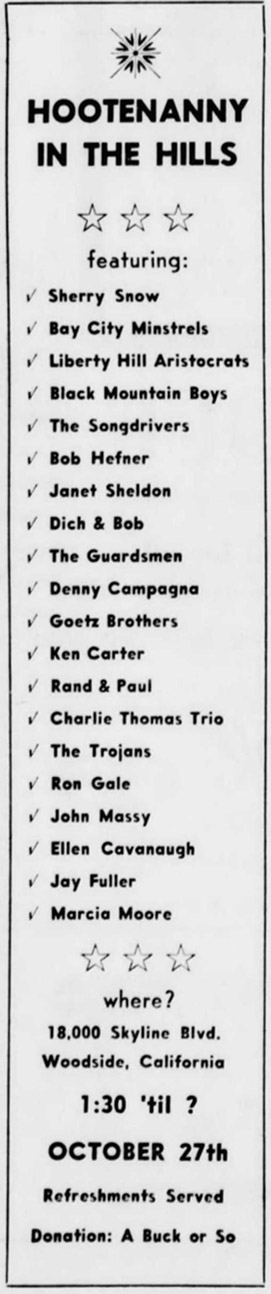 The Black Mountain Boys were part of a traveling folk circuit called the Bay City Minstrels in the fall. It was put together by a local promoter named Stan Llead. This event was a debut of sorts.