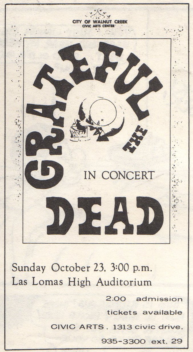 Several recollections at dead.net for this show. Las Lomas High School - October 23, 1966 From attendee Oakland Dupree "This was my first Grateful Dead show. There were maybe 50 -100 curiosity seekers . Very few teens like me. It was a free arts & lectures type concert in the afternoon. Jerry wore a yellow pigpen t shirt.. they were eating cookies offered them to audience."