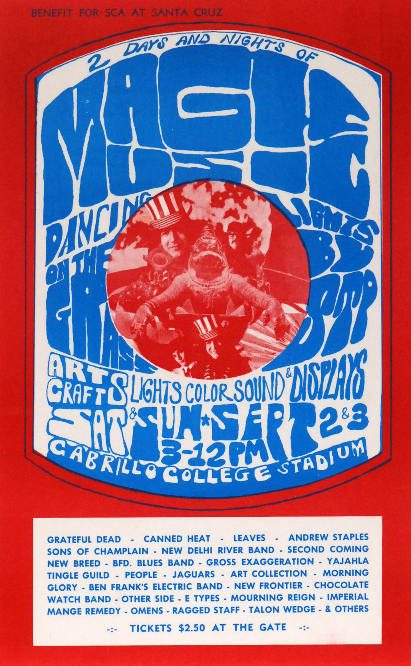Canned Heat, The Leaves, Andrew Staples, Sons of Champlain (sic), New Delhi River Band, Second Coming, New Breed, BFD Blues Band, Gross Exaggeration, Yajahla Tingle Guild, People, Jaguars, Art Collection, Morning Glory, Ben Frank’s Electric Band, New Frontier, Chocolate Watch Band, The Other Side, E-Types, Mourning Reign, Imperial Mange Remedy, Omens, Ragged Staff, and Talon Wedge & Others