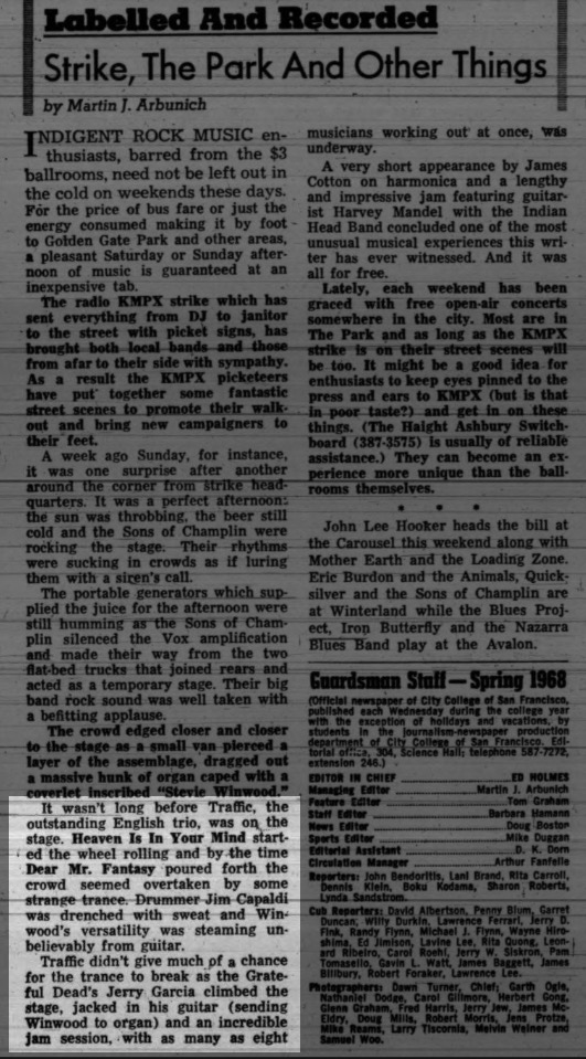 Garcia's appearance with Traffic was originally thought to have occurred on 3/18, but is now confirmed, via Arbunich 1968 (brought to light by commenter Steven Johnson at LLD), to have been 3/24. Arbunich's account supplies the following details: Sons of Champlin played first, then Traffic (the trio) did "Heaven Is In Your Mind", maybe some other tunes, and "Dear Mr. Fantasy". Garcia came onstage, plugged into Winwood's guitar amp, Stevie jumped to the organ, and a jam session ensued with up to eight players onstage at one time.