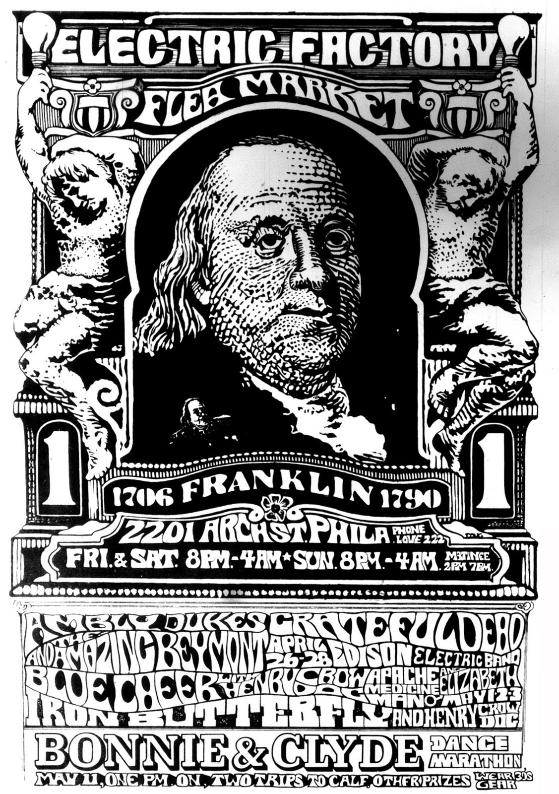 Edison Electric Band, Necrophilanthropy (per newspaper listing), The Amboy Dukes (per poster), and The Amazing Beymont (per poster)