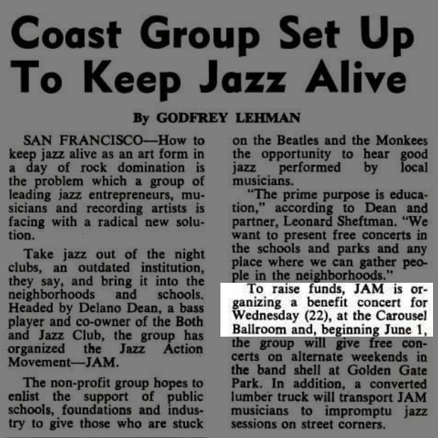 Per Lehman, Godfrey. 1968. Coast Group Set Up To Keep Jazz Alive. Billboard, May 18, 1968, p. 20, this was a benefit concert to promote bringing jazz into schools, with an organization called the Jazz Action Movement (JAM). Corry doubts this happened.
