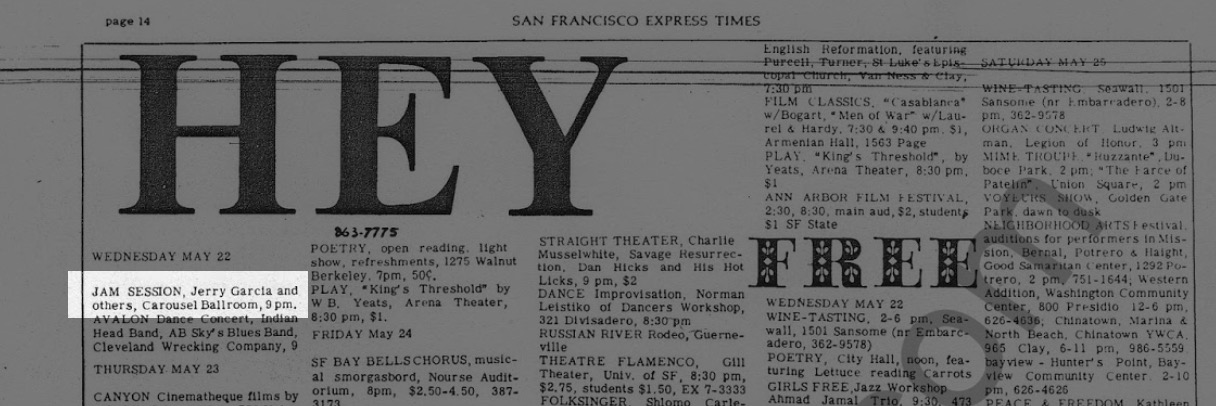 listing: San Francisco Express Times, May 22, 1968, p. 14, billing "jam with Jerry Garcia and others"