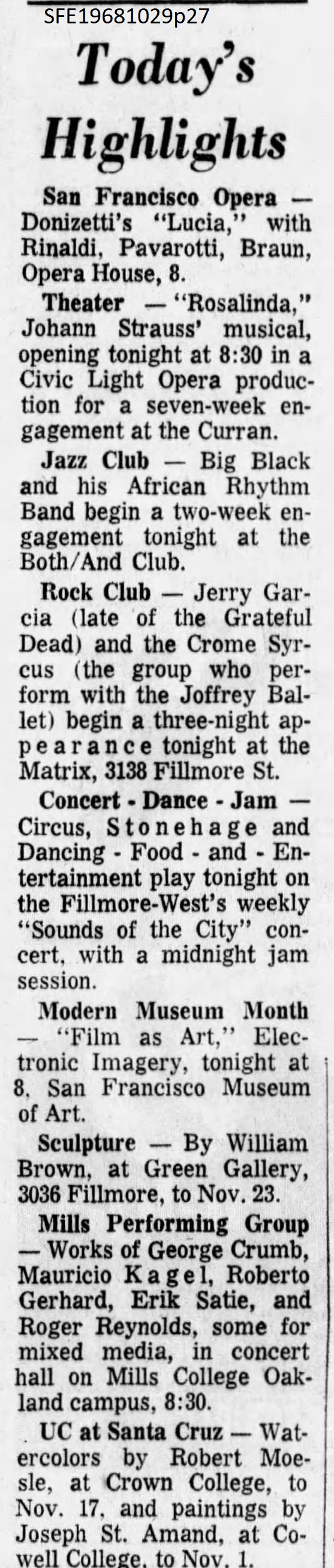 Per Latvala, 4x 4-track 15 ips reels of this event exist in the GD Vault (Dwork 1996, 26, h/t Deadlists)." Vault tape box identifies Bill, Mickey, Phil and Jerry.