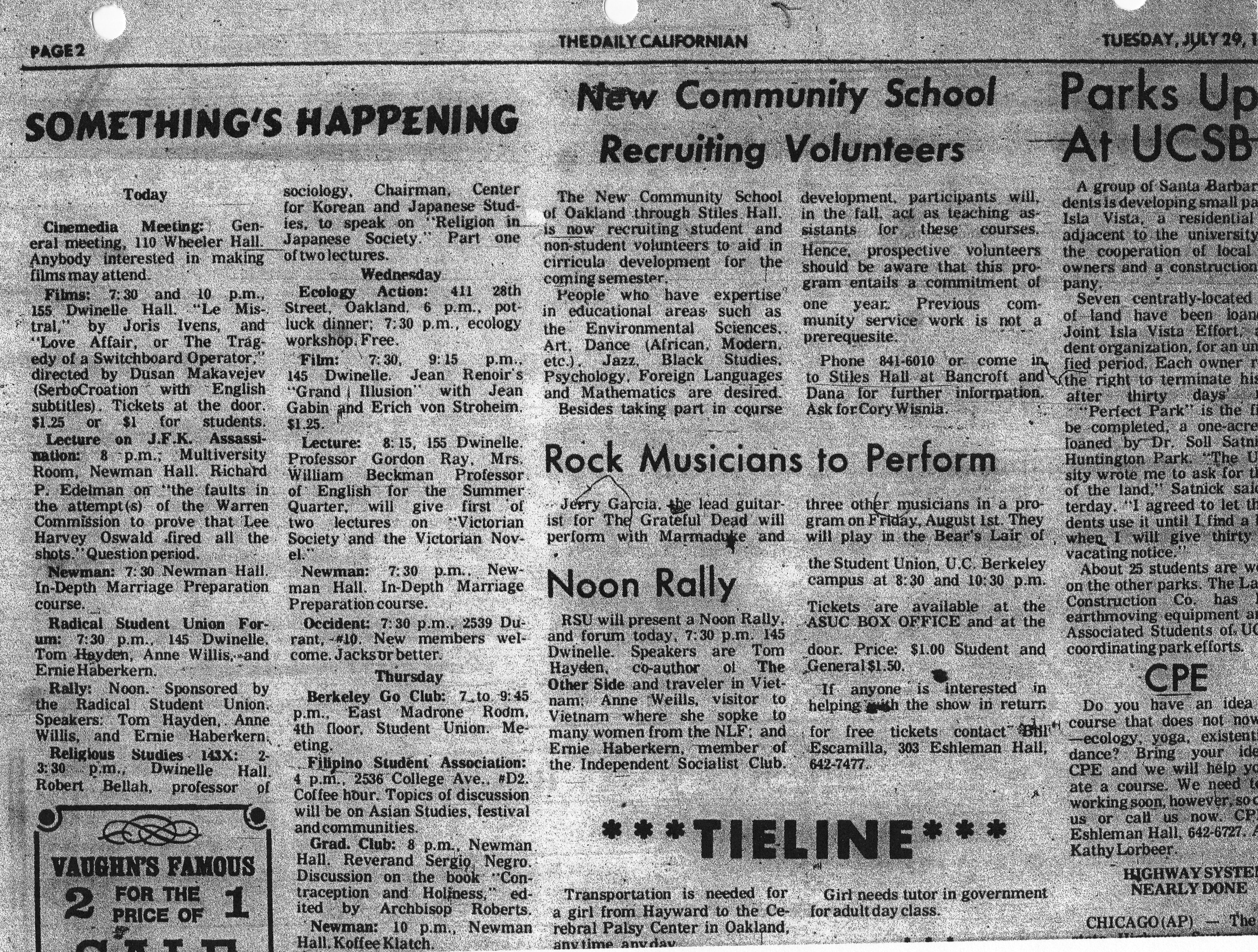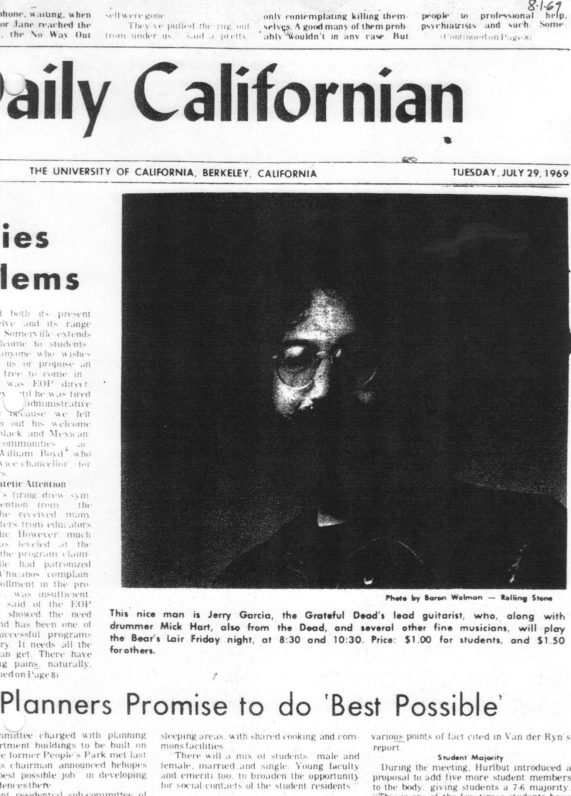 previews: "Rock Musicians to Perform," Daily Californian, July 29, 1969, p. 2 | "Jerry Garcia, Marmaduke," Daily Californian, August 1, 1969, p. 5