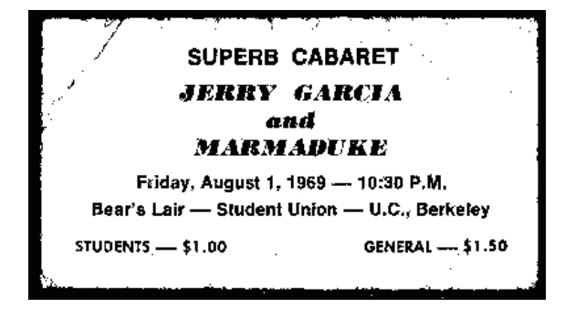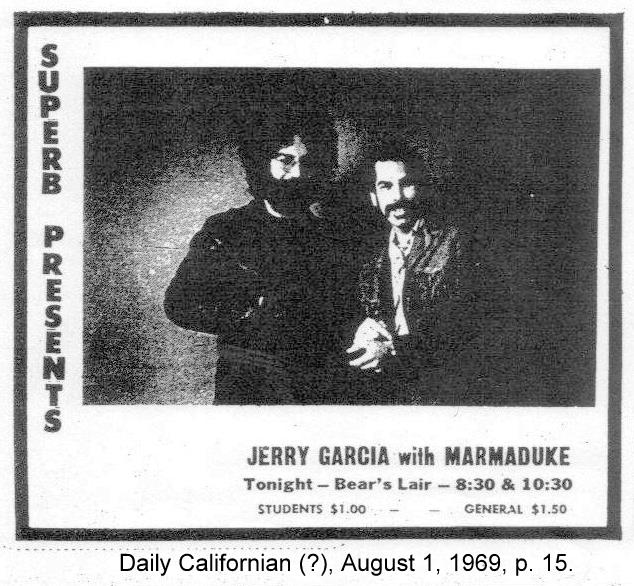 listings: Good Times, July 31, 1969, p. 24 ("Jerry Garcia, Marmaduke, Others") |San Francisco Chronicle, August 1, 1969, p. 42 |San Francisco Examiner, August 1, 1969, p. 27 |Berkeley Barb, August 1-7, 1969, p. 20