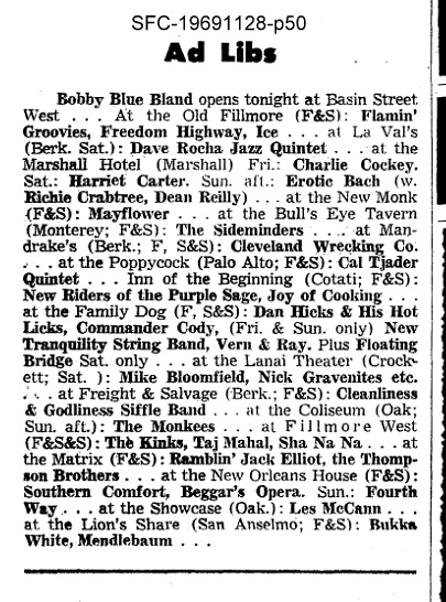 Grateful Dead/Jerry Garcia Tour Itinerary November 1969