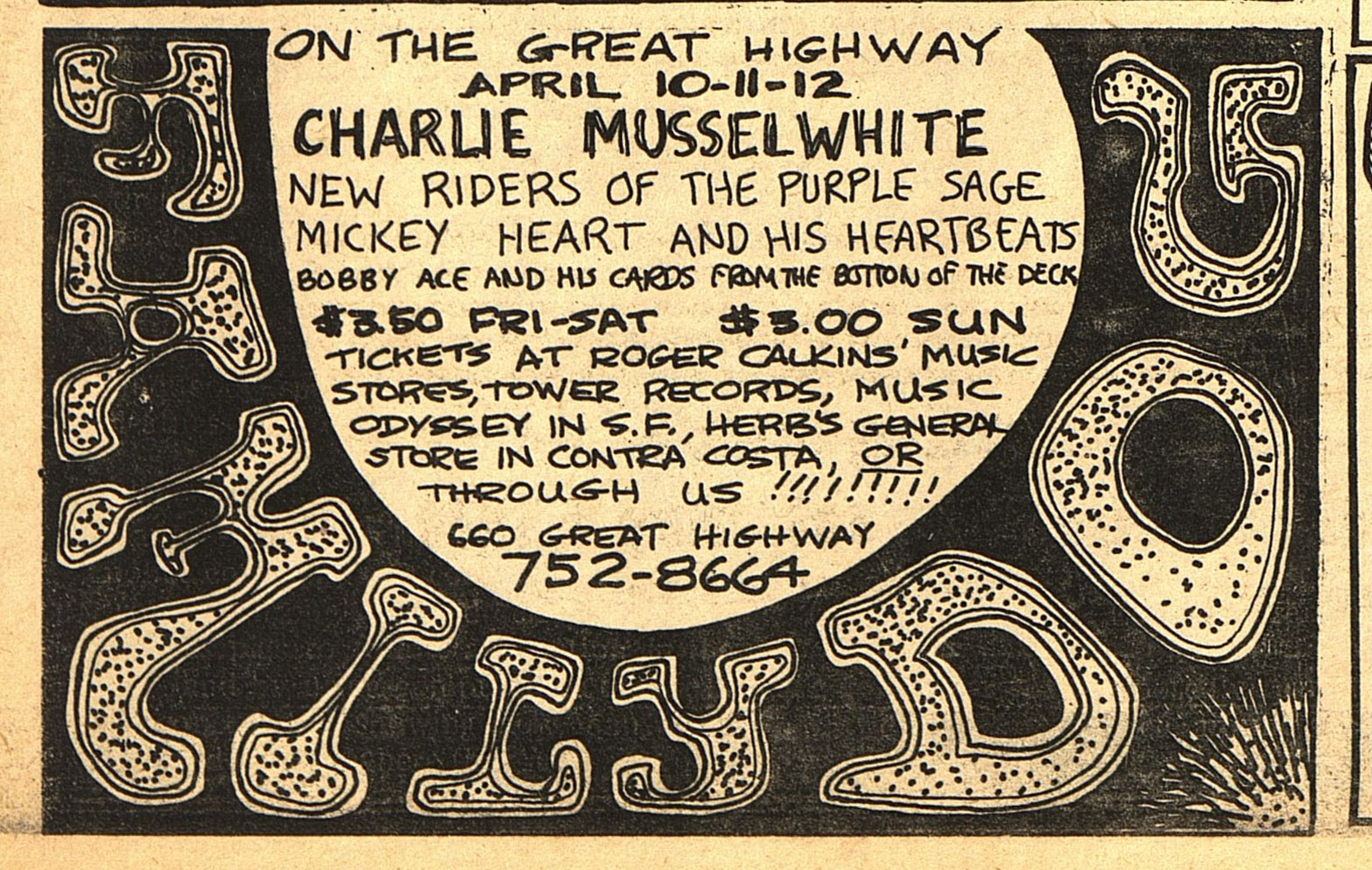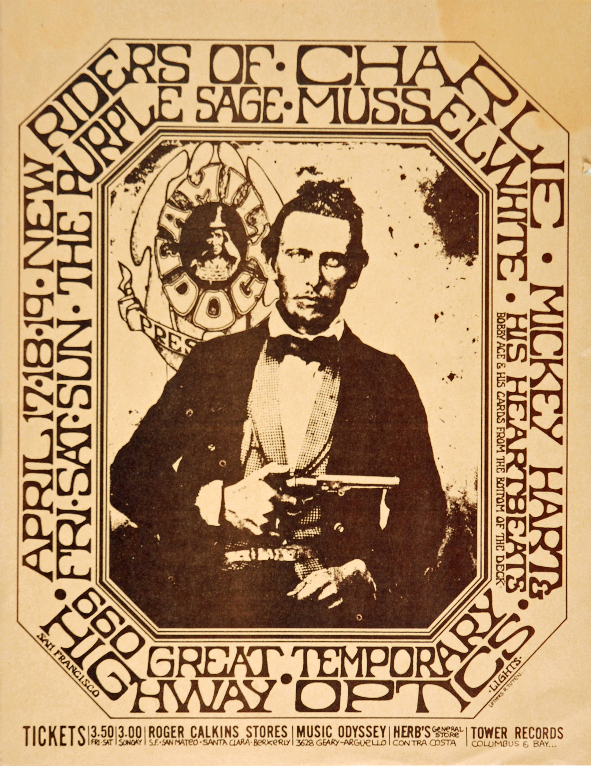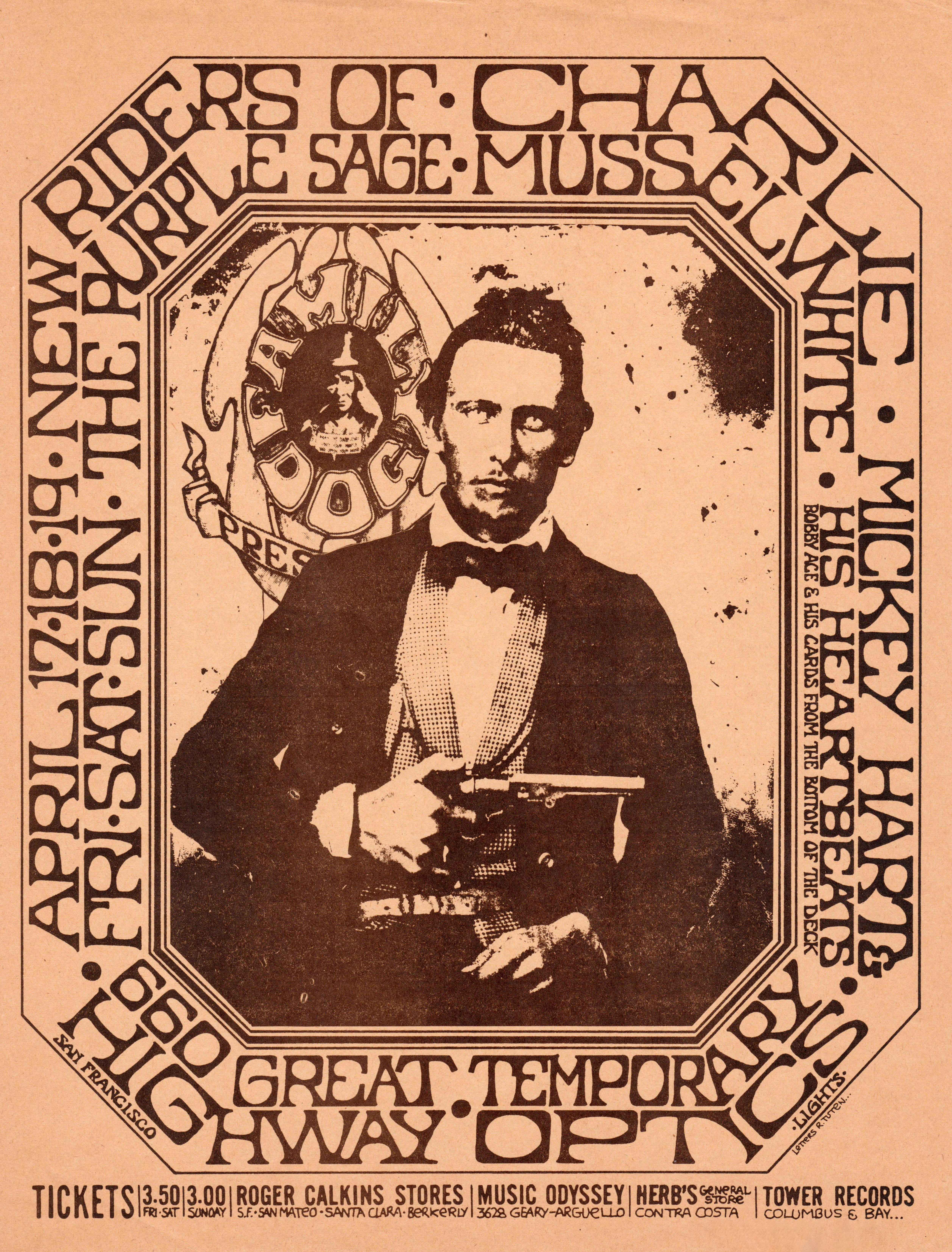 ad: Good Times v3 n16 (April 17, 1970), p. 14, billing Billed as "Riders of the Purple Sage avec Jerry Garcia, joined by Mickey Hart and the Heartbeats alias Bob Ace and his Cards From the Bottom of the Deck".