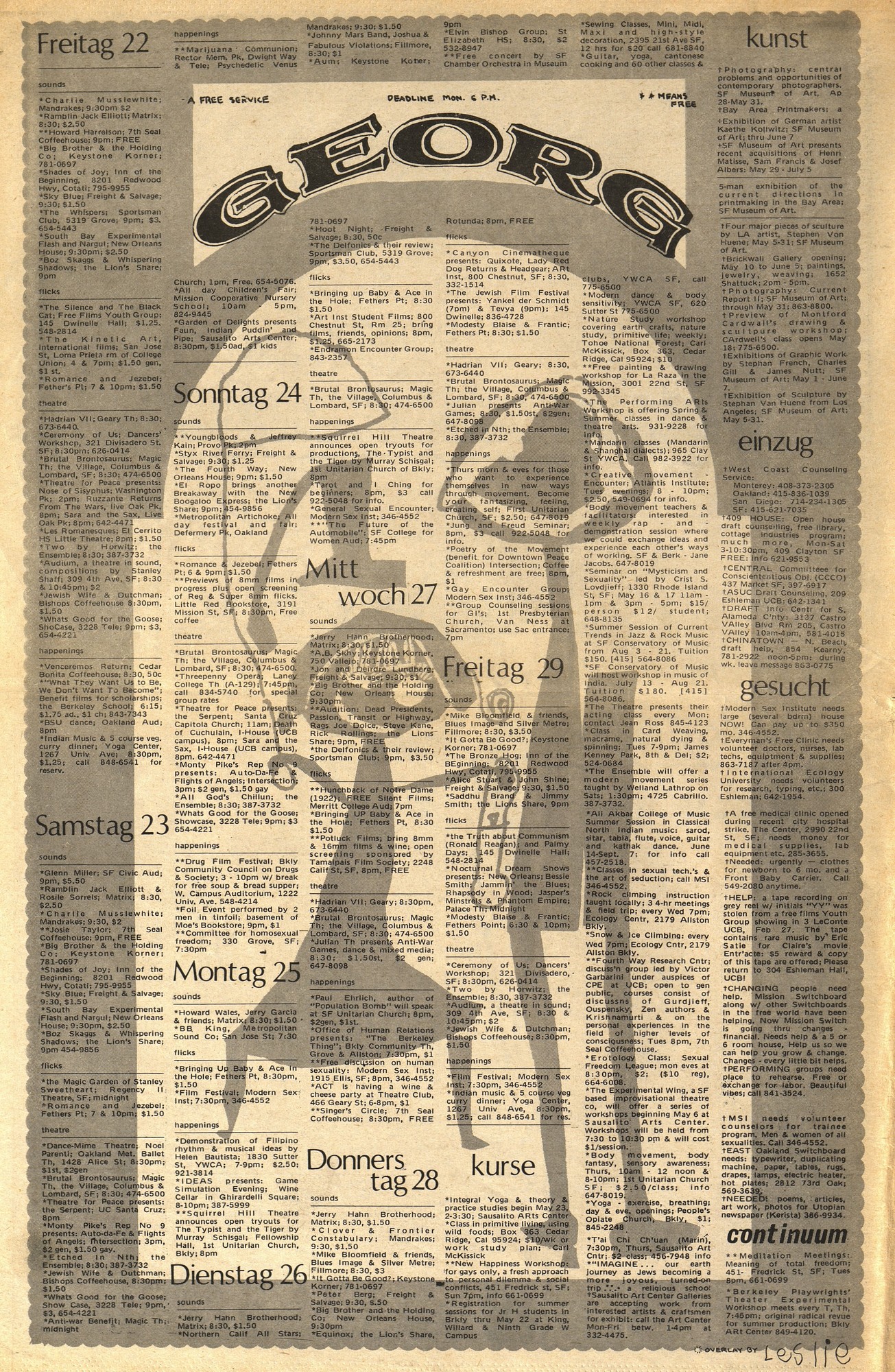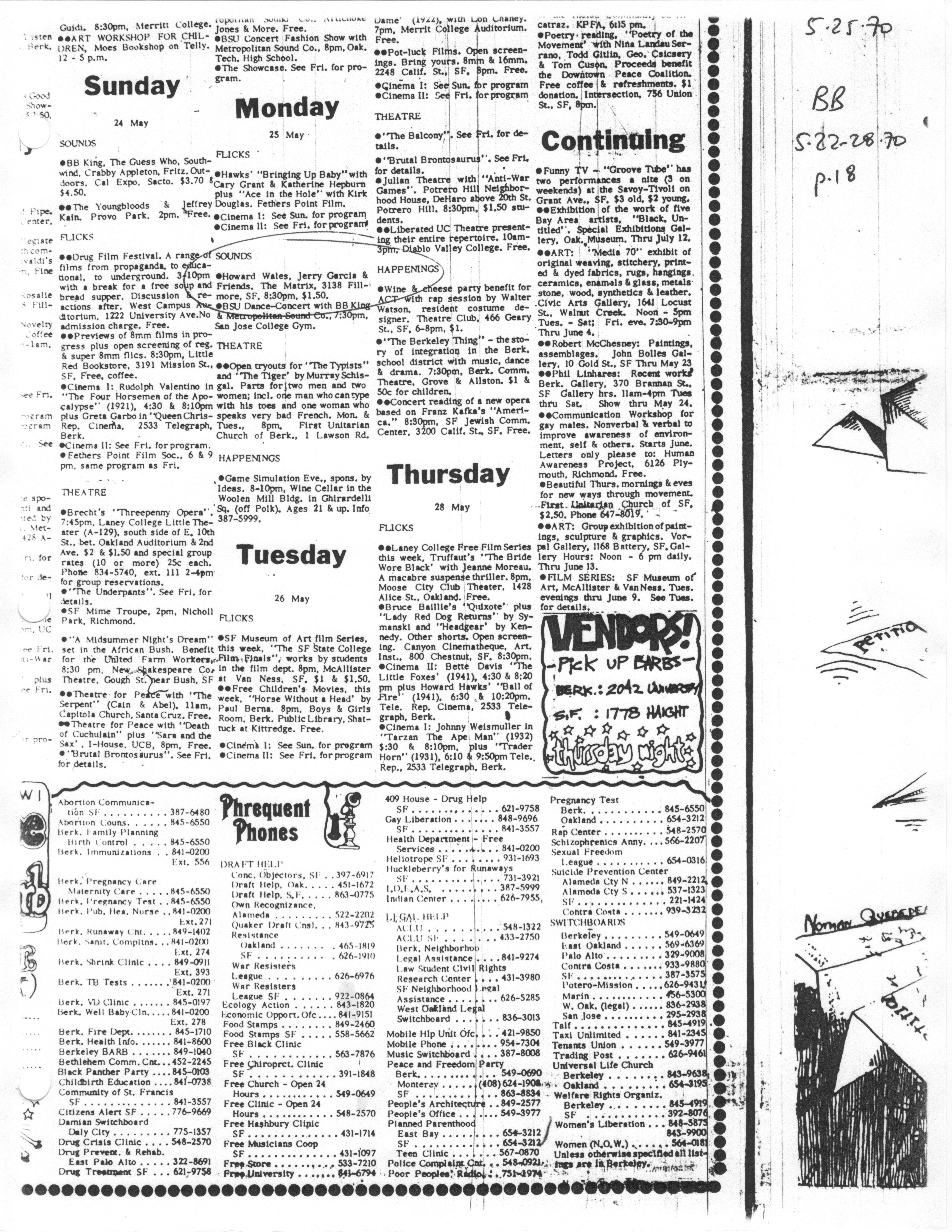 listings: Berkeley Tribe, May 22-29, 1970, p. 28; Synapse (UCSF), May 25, 1970, p. 4; San Francisco Chronicle, May 25, 1970, p. 44, billing as "Jerry Garcia, Howard Wales, et al."; Berkeley Barb, May 22-28, 1970, p. 18, billing as "Howard Wales, Jerry Garcia & Friends"