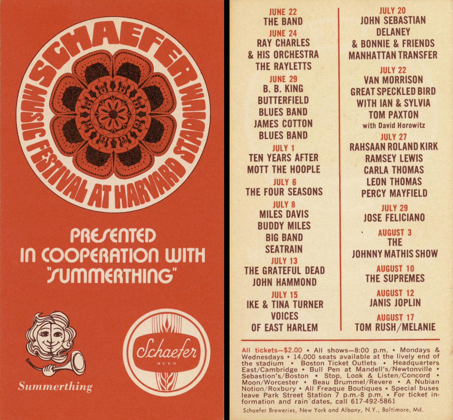 Brandon Smith: "The Dead were booked to play July 13, 1970 at Harvard Stadium in Allston, MA as part of the Schaefer Music Festival with John Hammond. [A pamphlet] identifies the lineup for the entire series sponsored by Schaefer Beer that summer (notice that the August 12th date was Janis Joplin’s last show before she died). A 7/10/70 article said the Dead had cancelled on that Wednesday (7/8/70) with no explanation, and were replaced with the Chambers Brothers (known for their hit “Time Has Come Today”). Thanks to Brandon and Corry for forwarding info.