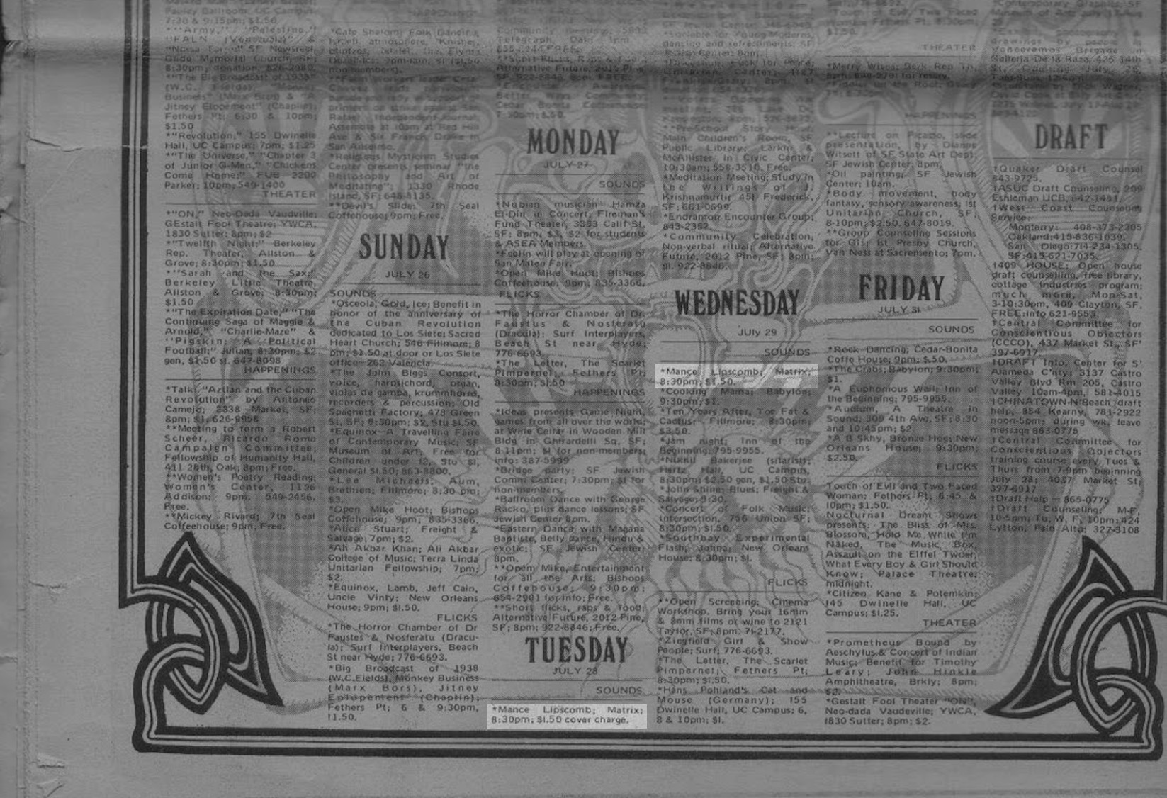 listings: [contra] Berkeley Tribe v.3 no.3 (no 55) (July 24-31, 1970), p. 28, bills nothing for 7/27 and Mance Lipscomb for 7/27-28 | San Francisco Chronicle July 27, 1970, p. 37, billing Mickey Hart and the Heartbeats, with Jerry Garcia