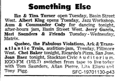 listings: San Francisco Chronicle, November 30, 1970, p. 43 (billing "Jerry Garcia, Merl Saunders and Friends") | San Francisco Examiner, December 1, 1970, p. 35