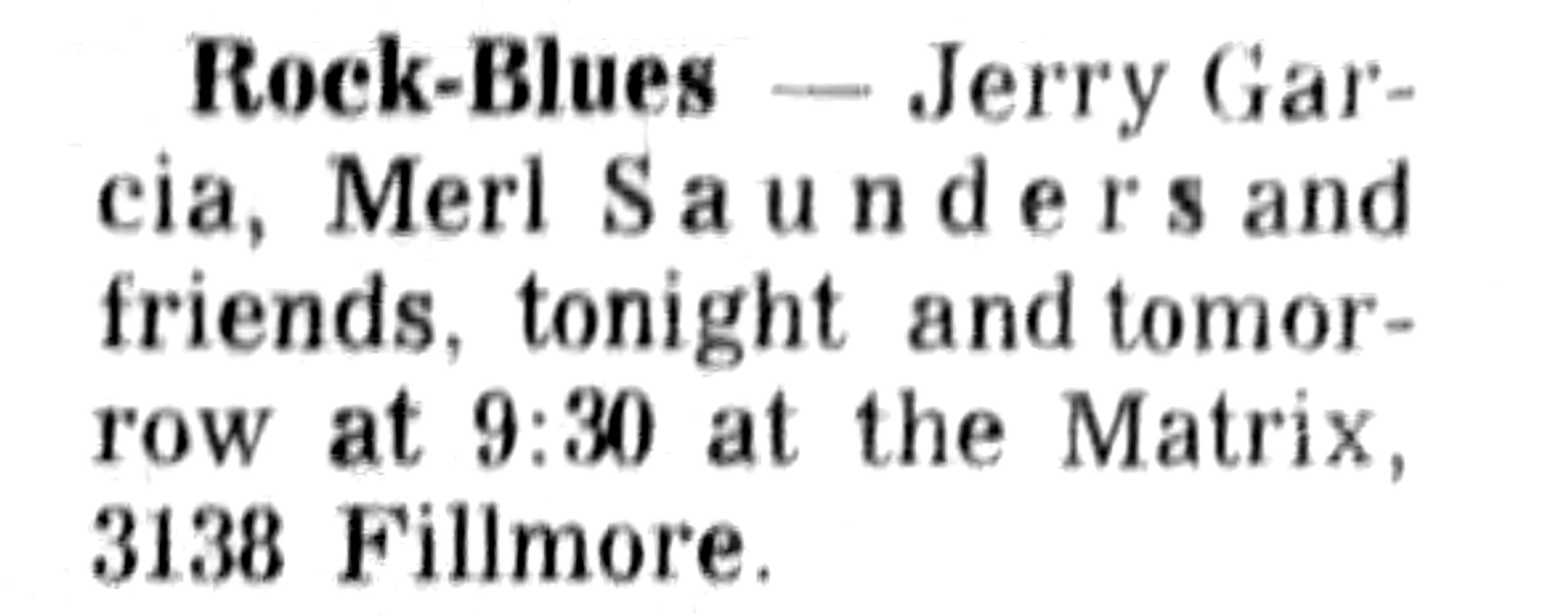 ad: Good Times v.3 n.47 (November 26, 1970), p. 20 (billing "Jerry Garcia, Merle [sic] Saunders & Friends")