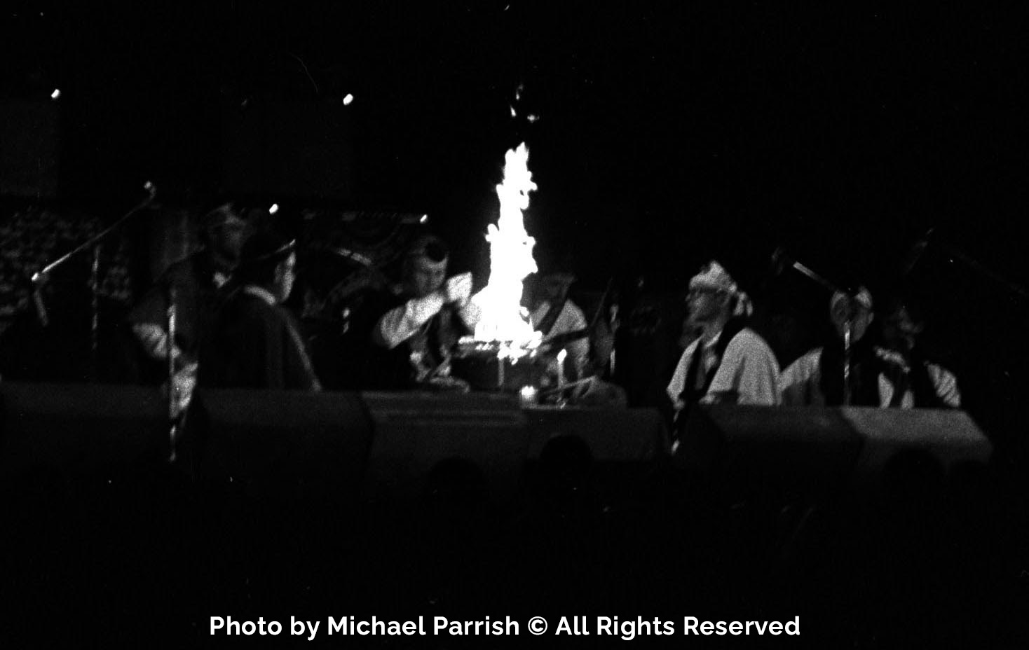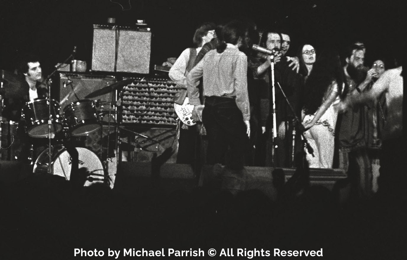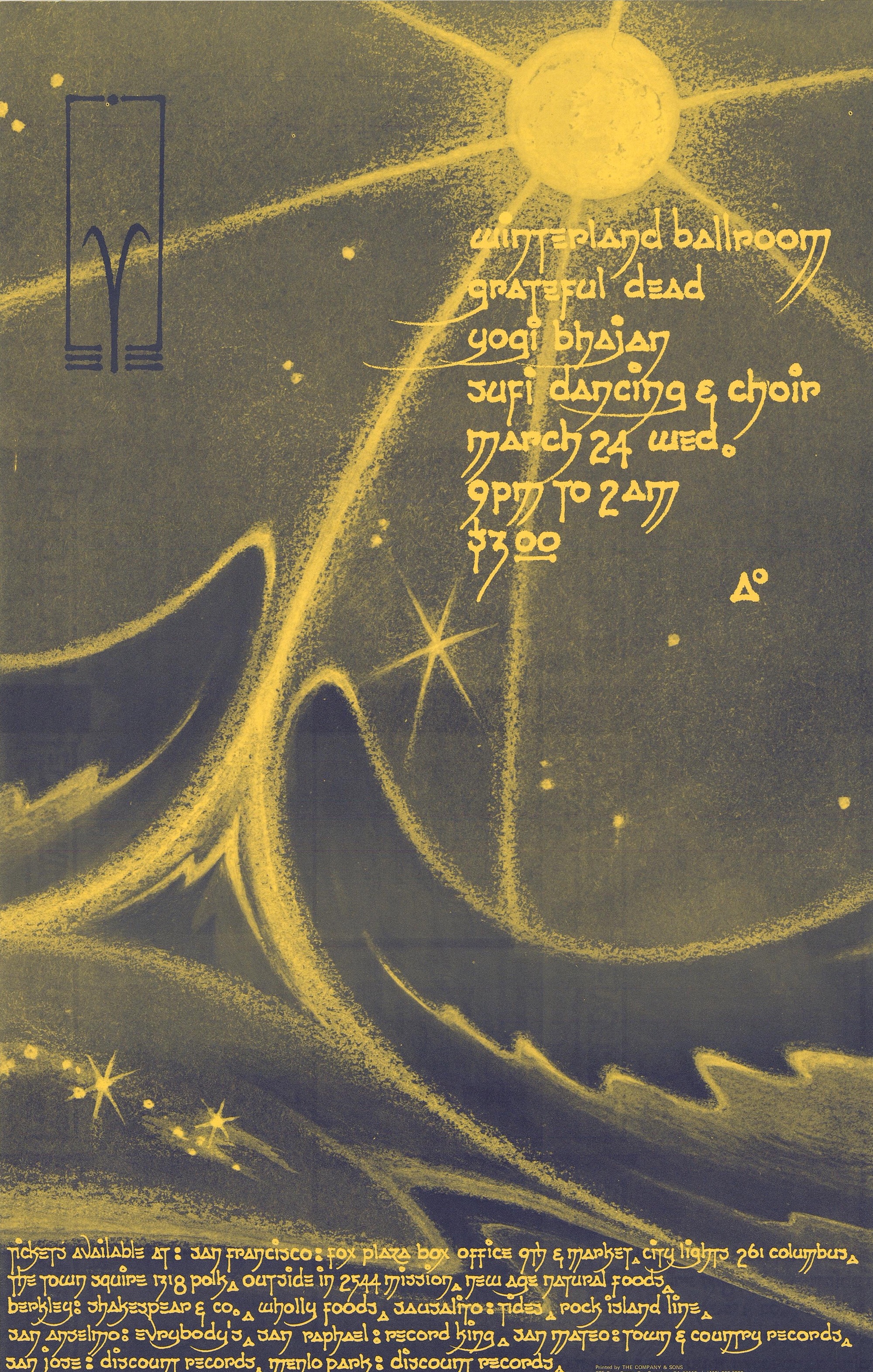 cryptdev: "Grateful Dead, Sufi Choir, Whirling Dervish Dancers and Yogi Bhajan, Winterland, 3/24/71: "After performing several beautiful pieces on their own, the choir was joined by Dead members Jerry Garcia, Bob Weir, Phil Lesh, and Bill Kreutzmann for their last two [ed: actually, three] pieces. The Dead members provided delicate droning chords below the choir’s angelic harmonies, with Garcia’s leads dancing around the choir’s melodies – a magical, all too brief collaboration". We do not know who the choir members would have been. Elwood: GD joined the "Sufi choir (about 25 voices). It was a glorious, wonderful combination. Harder rock was on the way as midnight came and went, Garcia remarking to me, 'It's all in the spirit, right there (thumping my chest) - we get it from music, they (waving to the stage) get in their own way. But the spirit's the same - we're all one.'"
