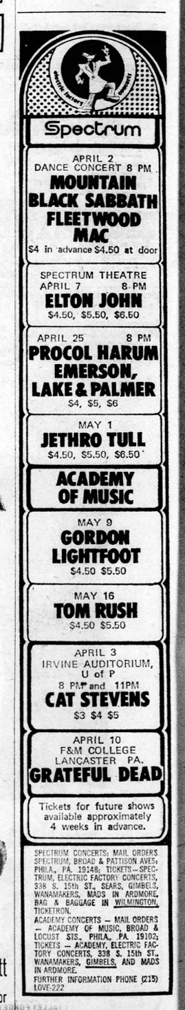 expost: Gerald Levy, "SUB Denies Oversell," Sunday News (Lancaster, PA), April 18, 1971, p. 14. Student Union Board president denies that they oversold the gig: 3,800 official tickets were printed for the 3,866 capacity. It was overcrowded because professionally-done counterfeit tickets were also printed.