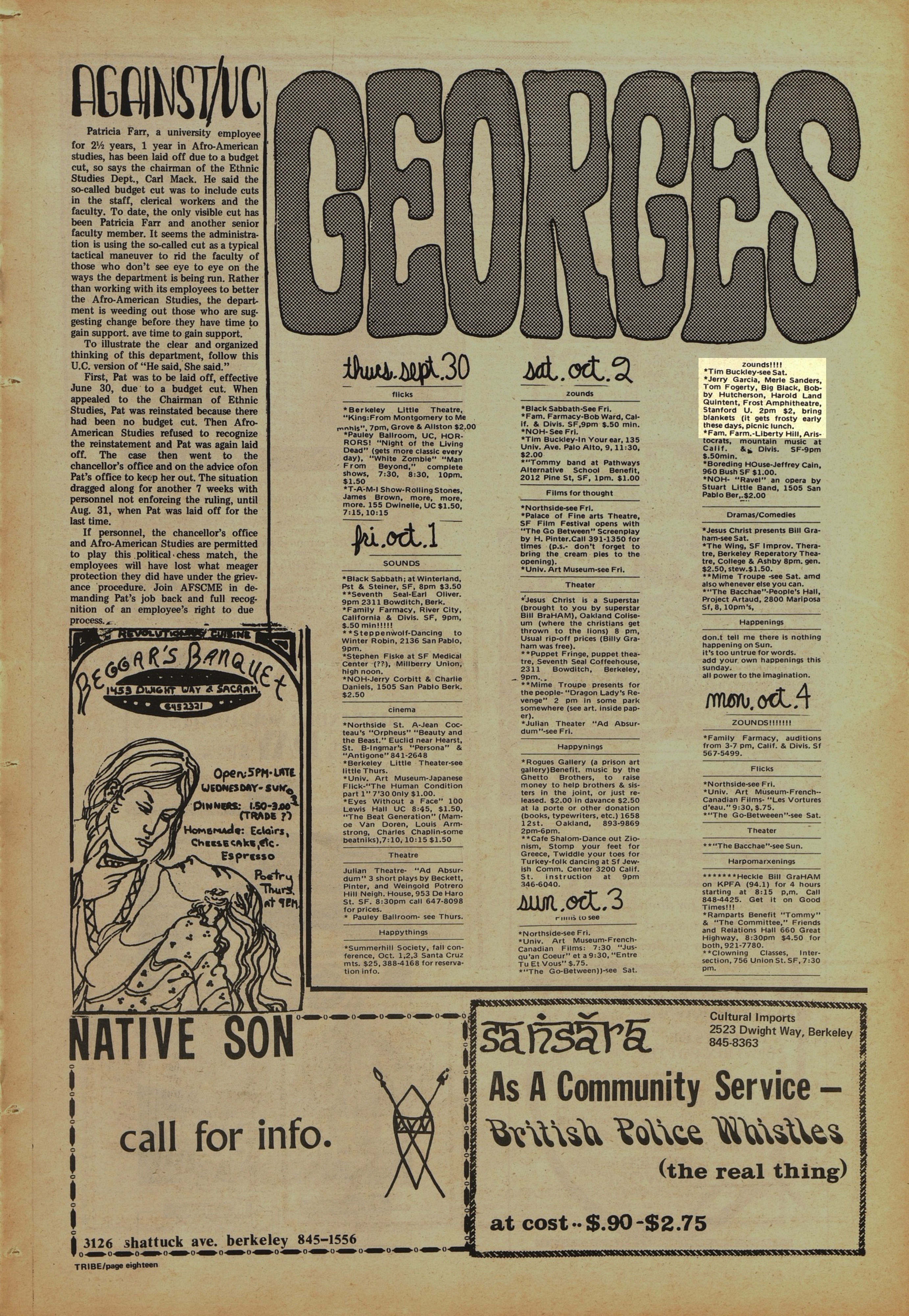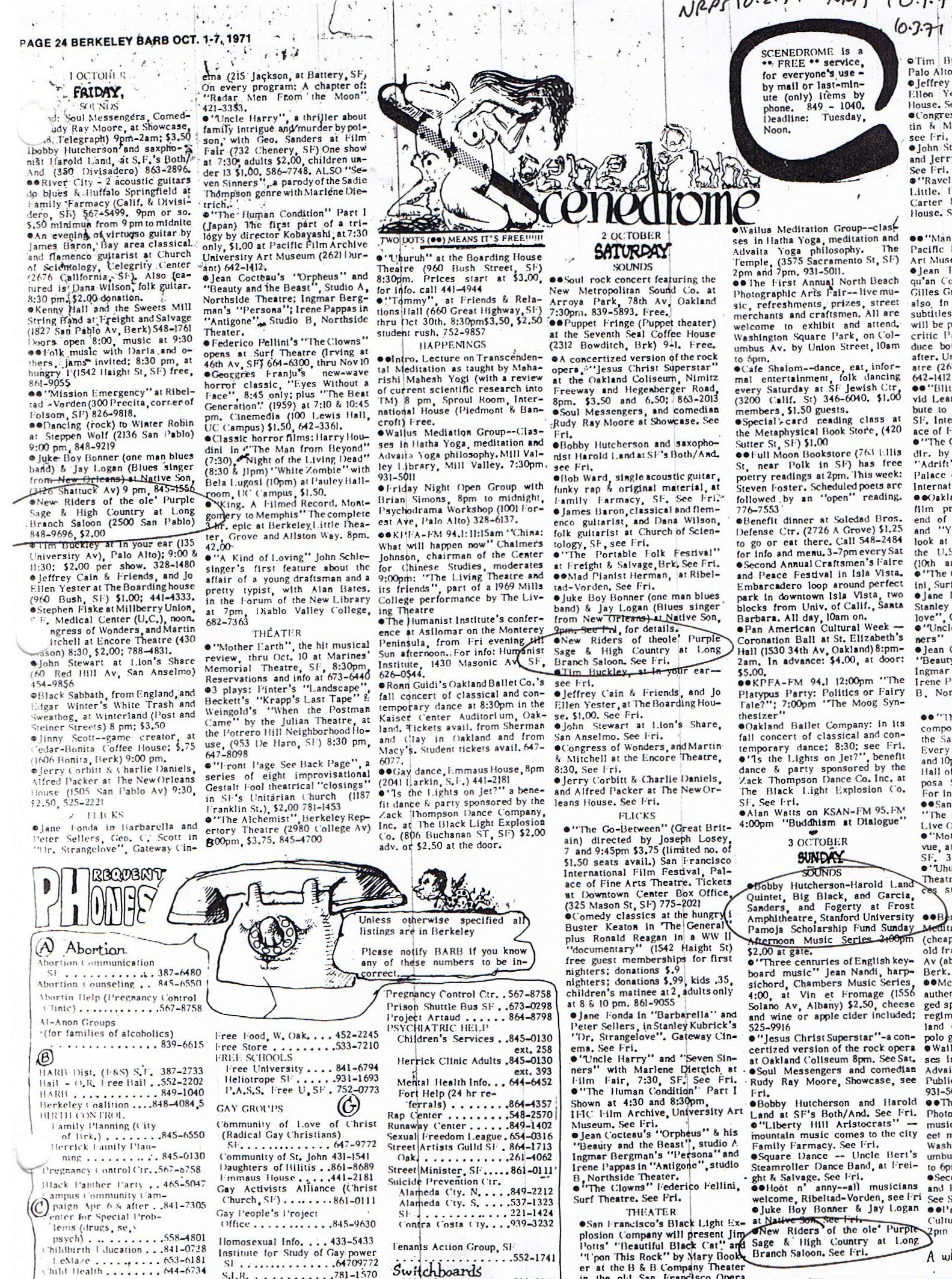 listings: "Stanford Concert Sunday," San Francisco Chronicle, October 1, 1971, p. 63 | "Scenedrome," Berkeley Barb, October 1-7, 1971, p. 24 | "George," Berkeley Tribe, October 1-7, 1971, p. 18 urging attendees to "bring blankets (it gets frosty early these days)"