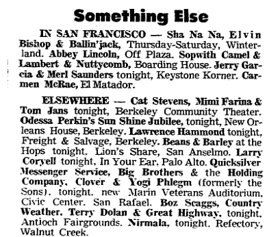 November 24, 1971, p. 20, billing "Jerry Garcia, Merl Saunders and Friends". See JGMF,