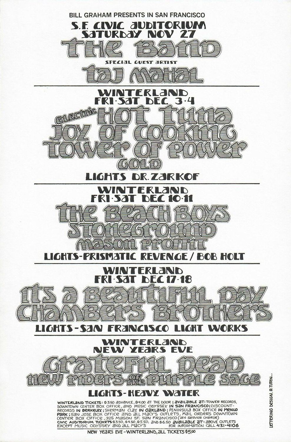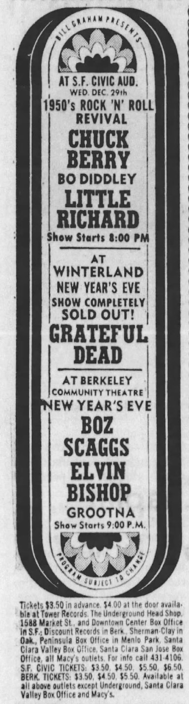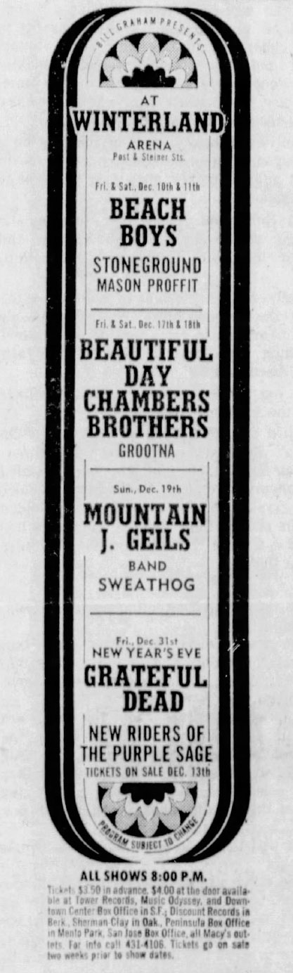 [1] Last known performance (by GD) 1970-12-22 (85 events ago) [2] First known performance [3] With Donna Jean Godchaux on vocals [4] Released on The Closing of Winterland Bonus Disc [5] First known performance last known performance on 1970-11-21 by Jerry Garcia - Misc as guest [6] Last known performance (by GD) 1967-06-06 (440 events ago)
