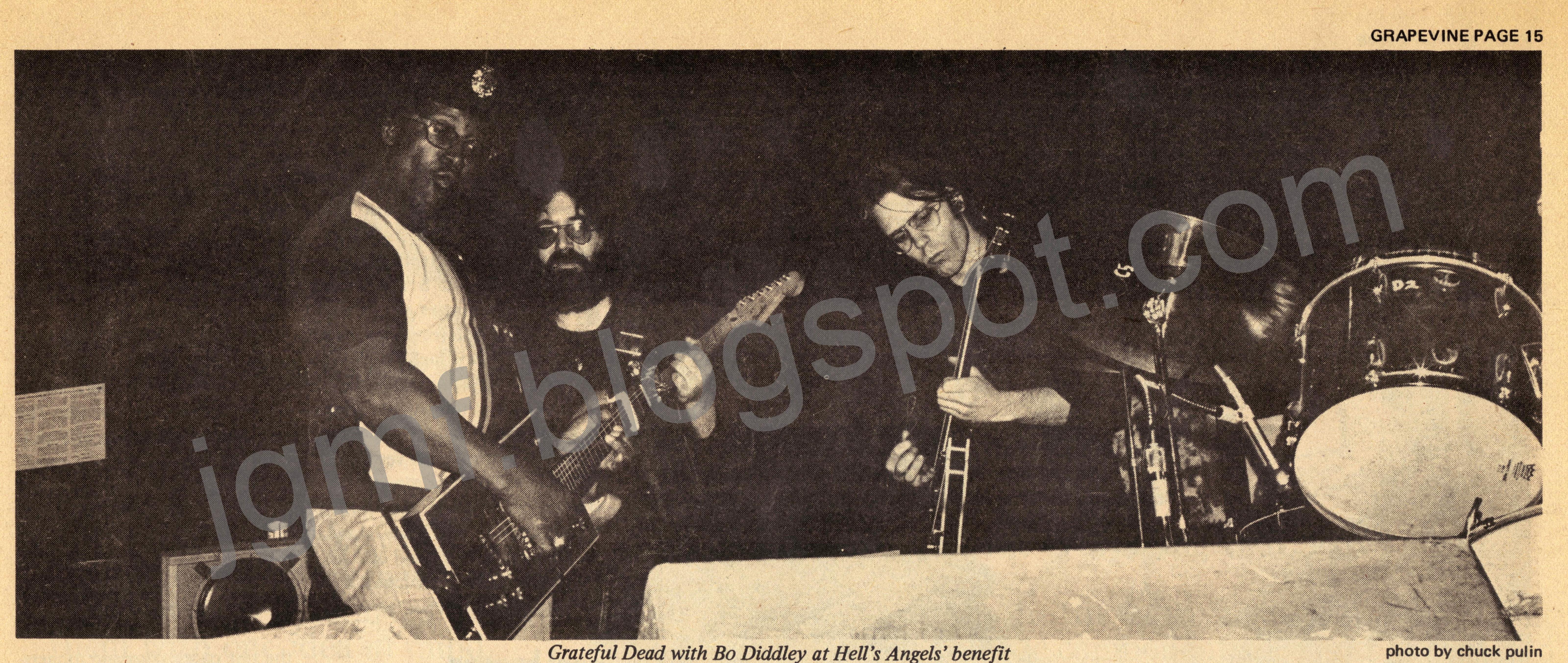 expost: GD "played as backup band for Bo Diddley, ranged in a grinning line behind Big Bo’s black silk bulk, the best band he’s ever likely to play with" (Carr 19720517).