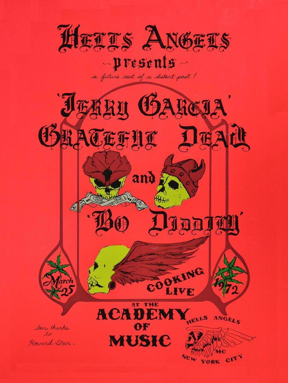 expost: "Hell's Angels Get 17G from N.Y. Rock Concert; Is This Tax Deductible?" Variety, March 29, 1972, p. 77. "The evening was highlighted by the arrival, at about 8:30 p.m., of about 50 or 60 couples on cycles plus a stagecoach. ... Neither the Dead nor Stein reportedly received profit from the gross, all coin going to the Angels."
