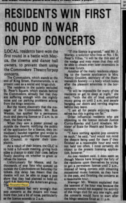 • Anonymous comment to JGMF via comment to JGMF tour opening London shows "1972-04-05 to 09, the London shows to start the Europe 72 tour were intended to be at the Rainbow Theatre in Finsbury Park but the owners went broke. The shows were switched to tne Commodore bingo hall in Hammersmith but Cutler thought that was too small so the Dead played the two nights at the Empire Pool in Wembley instead (McNally 2002, 425)."