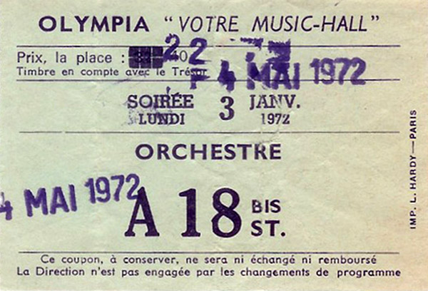 deadsources: May 1972: Paris "The second night at the Olympia was better than the first. There were only 30 or so cops on band - down from 180 the night before - a unique sort of .. review" of the Dead's music and audience when you think about it. Again all 2200 seats were filled. Again the audience crawled forward in a friendly inquisitive Gallic swell, applauding, cheering and chanting .. one more one more one more" at the end of another fourhour- long set. And this time, Jerry Garcia admitted afterward, .. We played peachy."
