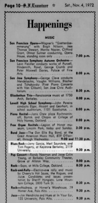listings: San Francisco Examiner, November 4, 1972, p. 10 (JG, MS and TF) |San Francisco Bay Guardian, November 15, 1972, p. 25