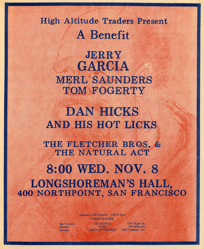 Philip Sicard spent several months in the Bay Area in late '72, and specifically recalls this gig. "There are details I’m absolutlely sure of: on November 8th at Longshotman’s Hall, Jerry (accompanied by Saunders, Bill Vitt, Tom Fogerty and John Kahn) sang only one song of his: They Love Each Other. I knew right away that he had written it. All the rest were covers the titles of which I didn’t know then."