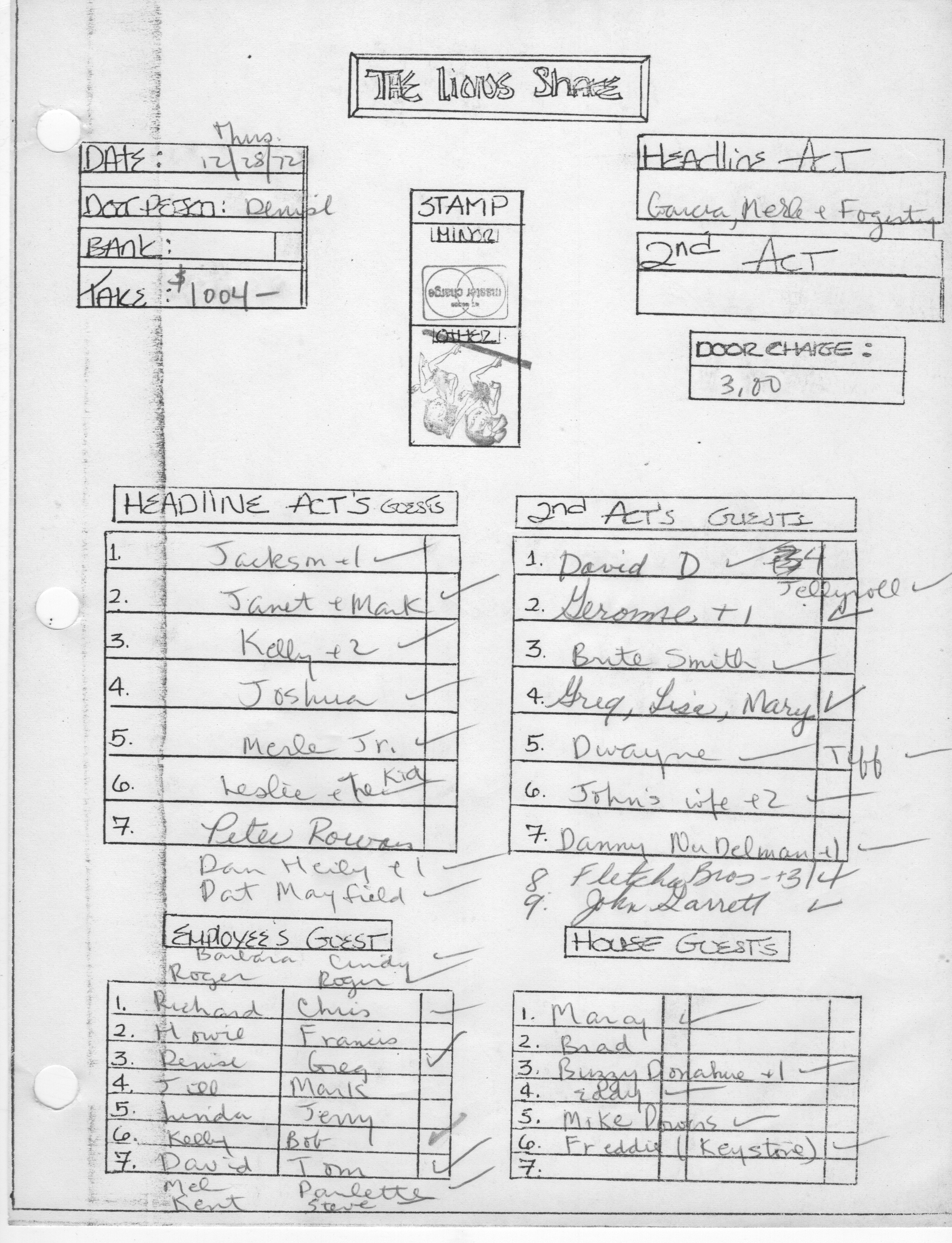 [1] First known performance [2] Only known performance [3] With Danny Cox on electric guitar and Roger "Jellyroll" Troy on electric bass [4] Only known performance (by JGMS) and final time played by any act last known performance on 1972-01-28 by HWJG [5] With Danny Cox on electric guitar and Roger "Jellyroll" Troy on electric bass and vocals [6] Final known performance (by JGMS) next performance on 1982-12-31 by GD [7] With unidentified-19721228-01 on trumpet