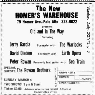 ads: Stanford Daily, February 23, 1973, p. 6 |Stanford Daily, February 27, 1973, p. 6 |Stanford Daily, February 28, 1973, p. 3: Ad (2/23) billing: "Bluegrass music with Old And In The Way featuring Jerry Garcia [name was larger, prominent] plus the Rowan Bros." 2/27 ad is just for OAITW: "The New Homer's Warehouse ... presents Old And In The Way featuring Jerry Garcia formerly with The Warlocks, David Diadem, formerly with Earth Opera, Peter Rowan, formerly lead guitar with Sea Train. Special guests The Rowan Brothers."