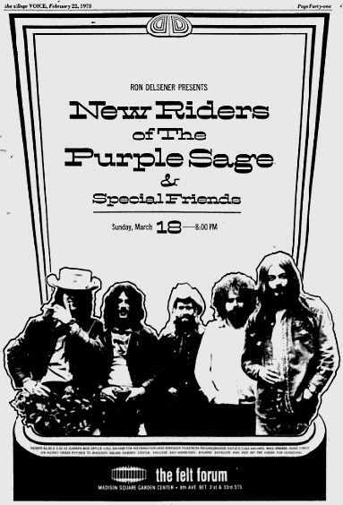 lostlivedead: "March 18, 1973 Felt Forum, New York, NY: New Riders Of The Purple Sage & Special Friends" "Ramblin' Jack Elliott and Donna Godchaux helped out on vocals on different songs, Jerry Garcia played electric guitar and banjo on a few numbers, Bob Weir sang a couple, and Keith Godchaux played grand piano for much of the show. The most memorable part of the performance, however, was when Garcia, Weir and Godchaux joined the New Riders and began the second set with a trio of gospel numbers: "Cold Jordan", "I Hear A Voice Calling" and "Swing Low". Garcia played banjo and Weir played acoustic guitar". "Besides the mini-acoustic set, Garcia played banjo on "Henry" as well as electric guitar on "Glendale Train," obviously just having the kind of fun he couldn't have if the marquee had said 'tonight: NRPS with Jerry Garcia'"