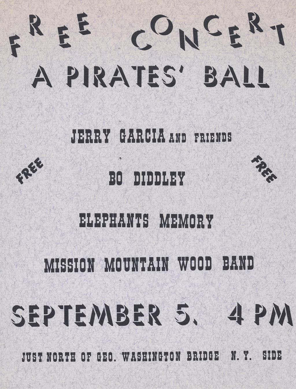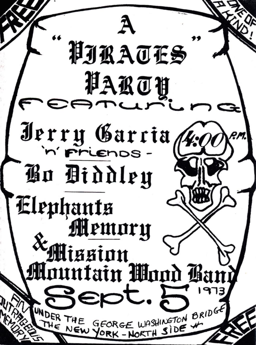 Jerry and Merl's first east coast gig, the day after putting Garcia-Saunders-Kahn-Vitt Live at Keystone in the can. Flaxman reports that Montana country-rock group Mission Mountain Wood Band would be opening and asked him to serve as 'quippie, in front of Elephant's Memory, Bo Diddley and JGMS. Parish calls it "one of the wildest shows I've ever experienced. There was endless bad judgment on display that night" (Parish 2003, 103). They stayed at the Navarro.
