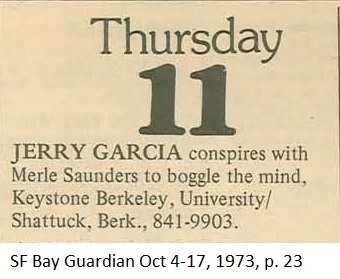 Venue confusion. San Francisco Sunday Examiner and Chronicle Datebook, SF Bay Guardian, SFE and Rex's writing on Betty's tape show Keystone. "Rock, Jazz in Bay Area," San Francisco Chronicle, October 10, 1973, p. unk. lists Earthquake tomorrow. Kurt Huget's Lion's Share research shows JGMS at the Share this night. I will go with Rex. SF Bay Guardian listing reads "Jerry Garcia conspires with Merle [sic] Saunders to boggle the mind".
