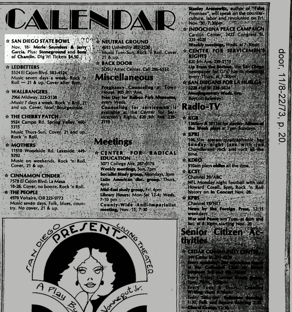 We were not able to find any mention of this gig in the SDSU Daily Aztec archives, which are available online. Vol 53 no 45 11/16/73 no mention anywhere. Possibly rained out?