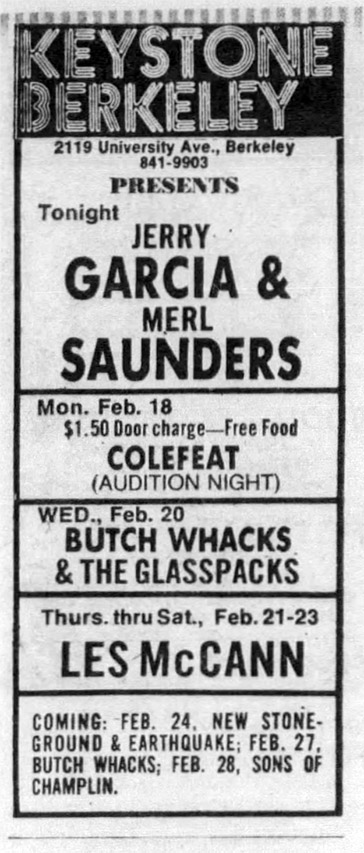 listings: Fremont Argus, February 8, 1974, p. 7 |Foghorn, February 15, 1974, p. 9 |Hayward Daily Review, February 15, 1974, p. 51 |San Francisco Examiner, February 15, 1974, p. 39 |San Francisco Examiner, February 16, 1974, p. 8