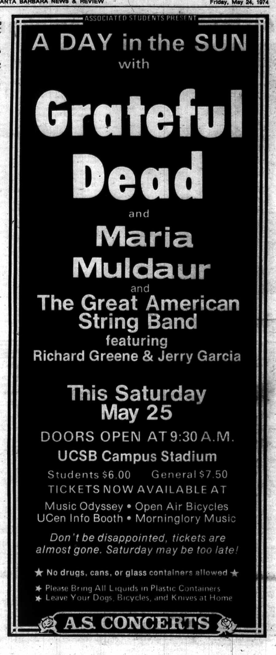 ad: Santa Barbara News-Press, May 24, 1974, p. 24, billing "Great American String Band featuring Richard Greene and Jerry Garcia".