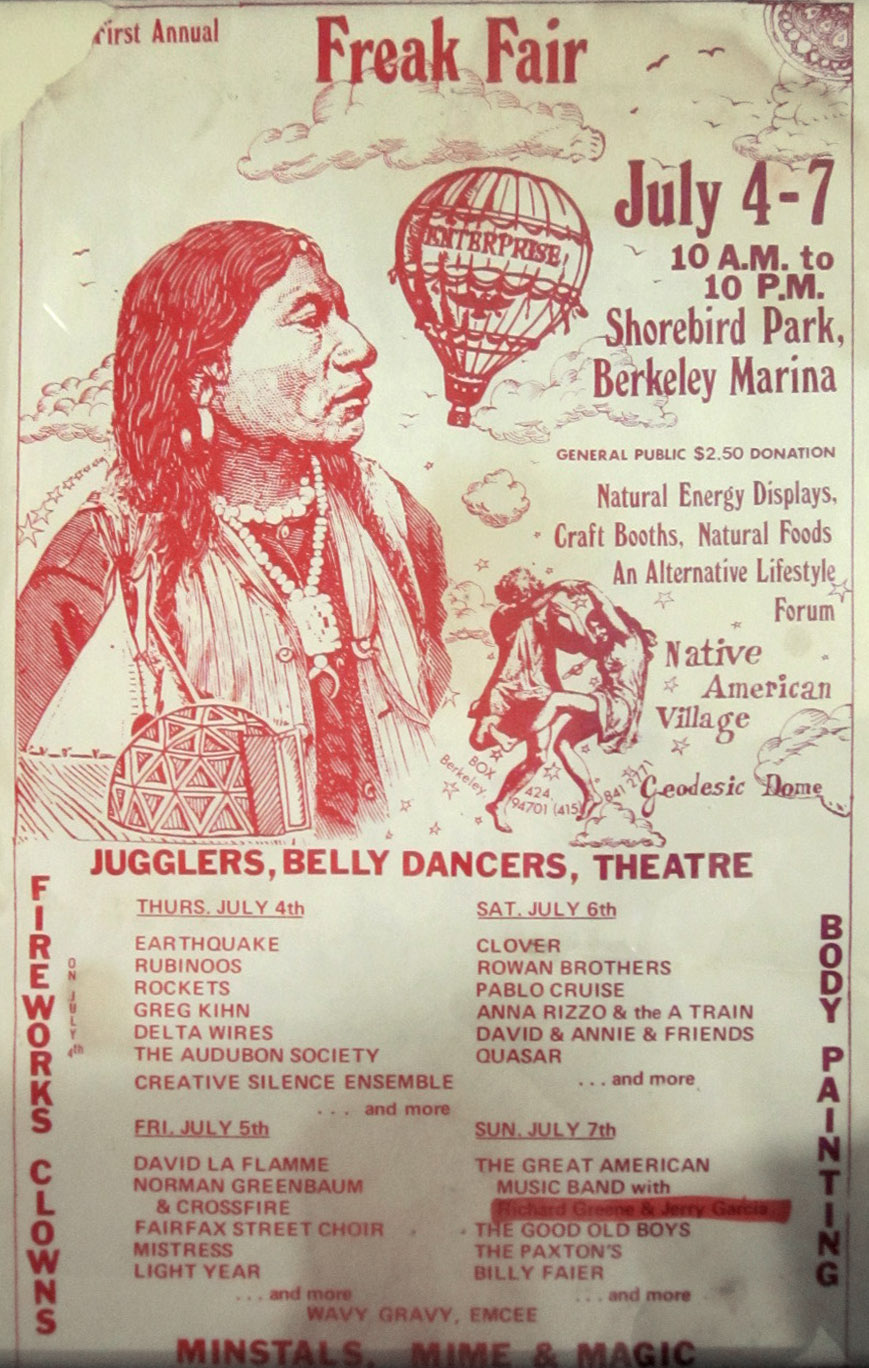 A "Freak Fair" from July 4-7, 1974 at the Berkeley Marina was advertised with a red-and-white line drawn poster feautring a native American, a hot air balloon "Enterprise", a geodesic dome, and mintrally-inspired freaks dancing. Among the attractions: jugglers, belly dancers, theatre, fireworks, clowns, body painting, minstals [sic], mime & magic, natural energy displays, craft booths, natural foods, an alternative lifestyle forum, native American village, geodesic dome. General public $2.50 donation. The "Great American Music Bandwith Richard Greene & Jerry Garcia" is advertised, but the second line, with Greene and Garcia's name, is blotted out in red, while the band name is not. As of 12/9/2012, this is the latest known mention of JG in connection with this band.