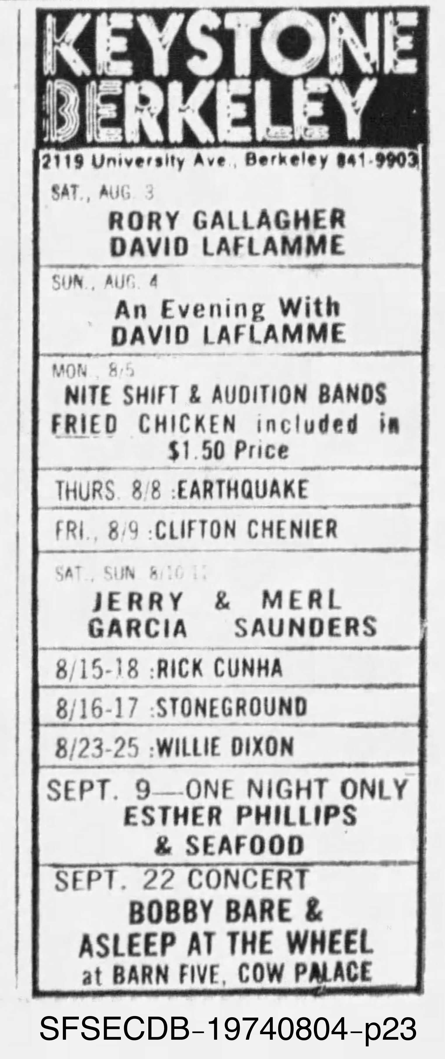 mentions: "Docker Hill Boys Set Stand at Lion's Share," Independent-Journal [San Rafael, CA], August 9, 1974, p. 20 [image of Merl Saunders, caption "Merle {sic} Saunders With Jerry Garcia"] | Staska and Mangrum 19740809: "Jerry Garcia & Merl Saunders with Paul Pena play [Keystone Berkeley] Aug. 10-11" | "Happenings for South County Teens," Hayward Daily Review, August 10, 1974, p. 5