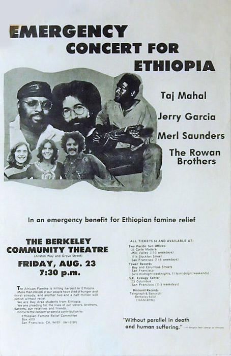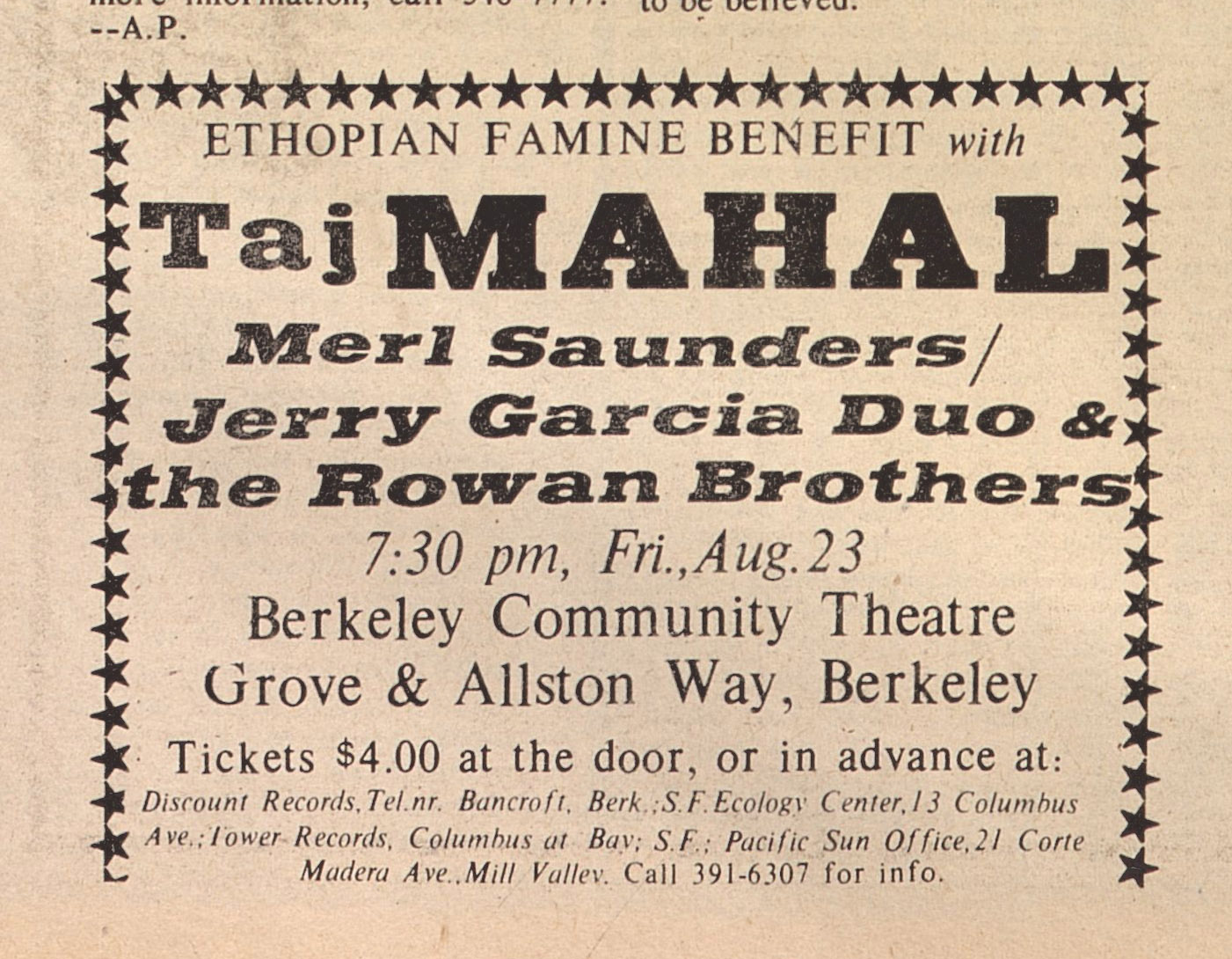 announcements: "Ethiopian Benefit," San Francisco Examiner, August 13, 1974, p. 31 | "Famine Benefit," San Francisco Examiner, August 19, 1974, p. 35 | UPI, "Ethiopians cite famine," Hayward Daily Review, August 22, 1974, p. 37