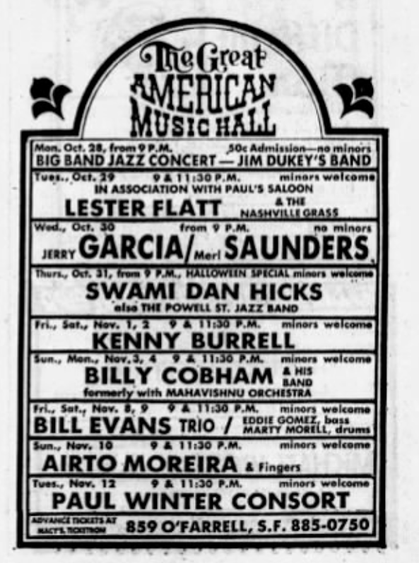 listings: [garbled] Stanford Daily, October 24, 1974, p. 5; talking about Rahsaan Roland Kirk and others at Keystone Korner (i.e., SF), then continuing "Wednesday's 9 pm performance features Merl Saunders and Jerry Garcia. Sorry, no minors allowed this night." The latter is language used by the GAMH, so this looks like a typesetting kind of error |Hayward Daily Review, October 25, 1974, p. 48 |San Francisco Sunday Examiner and Chronicle Datebook, October 25, 1974, p. 5 |San Francisco Examiner, October 30, 1974, p. 27