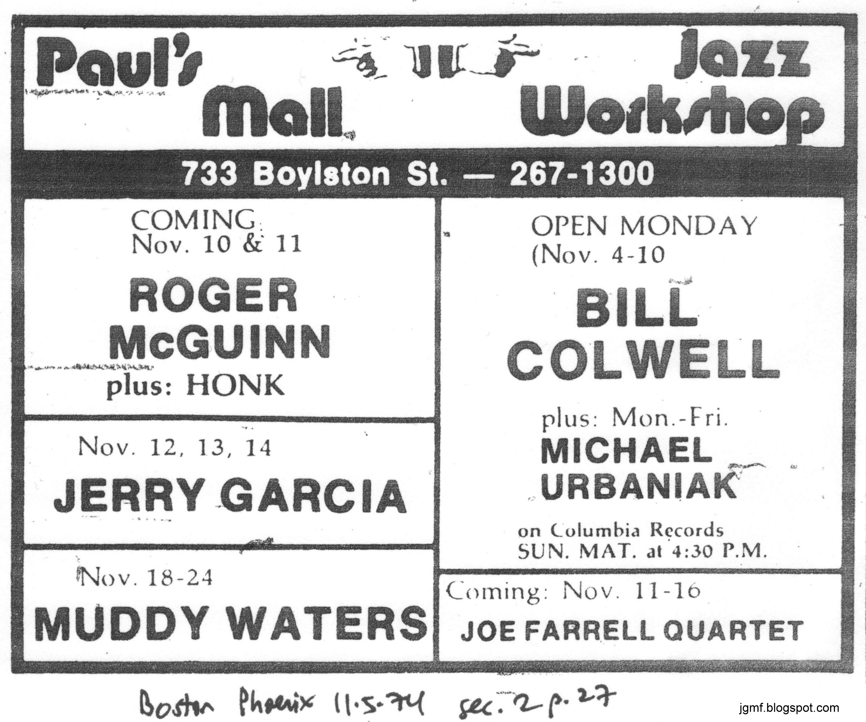 AFM source lists address as 739 Boylston Street. Ad in Boston Phoenix bills only as "Jerry Garcia" and doesn't mention early/late shows, but AFM contract shows early and late. For the six shows, JGMS get $5,000 guarantee plus 70% gross receipts over $8,100.
