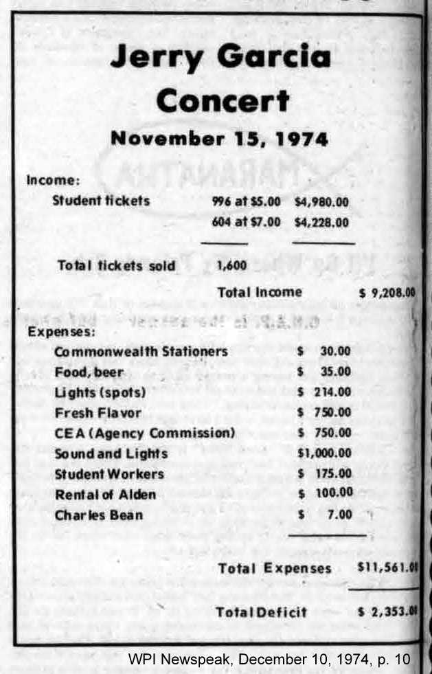 expost: Fine 1974, noting the concert lost more money for the school because Garcia insisted on playing smaller Alden Hall rather than larger Harrington Hall | "Jerry Garcia Concert," Newspeak, December 10, 1974, p. 8