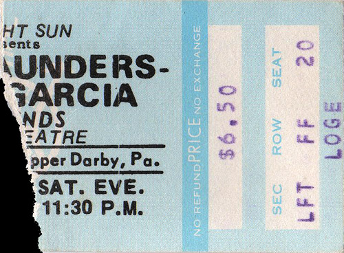 Ticket bills as "Merl Saunders, Jerry Garcia & Friends". Promoter Midnight Sun (Rick Green). Sue: Guarantee $10,000 + $250 for sound for the two shows.