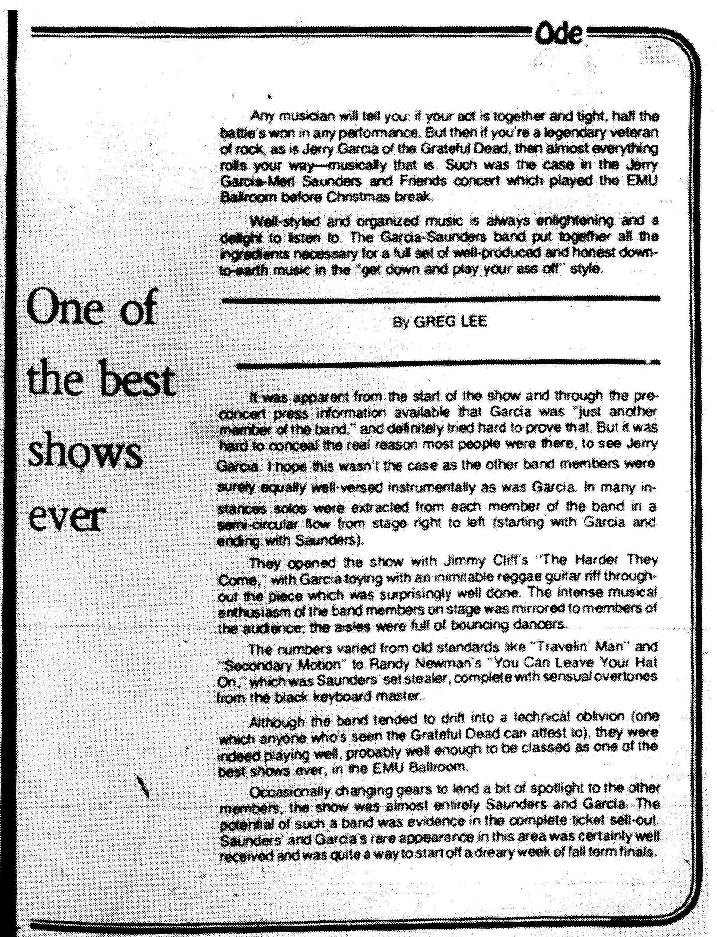 mention: Greg Lee, "ODE - the Emerald's weekly entertainment guide," Oregon Daily Emerald, December 12, 1974, p. B1, billing JGMS and Friends. Notes 950 tickets available, only onsale at the EMU main desk.