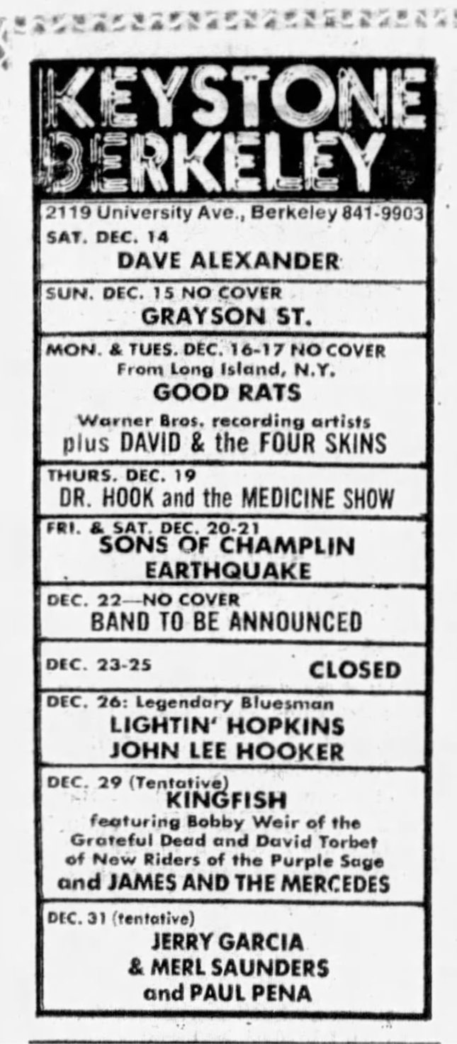 ads: San Francisco Sunday Examiner and Chronicle Datebook, December 22, 1974, p. 27 billing JGMS as tentative | [contra] San Francisco Sunday Examiner and Chronicle Datebook, December 29, 1974, p. 23, billing Lucky Strike