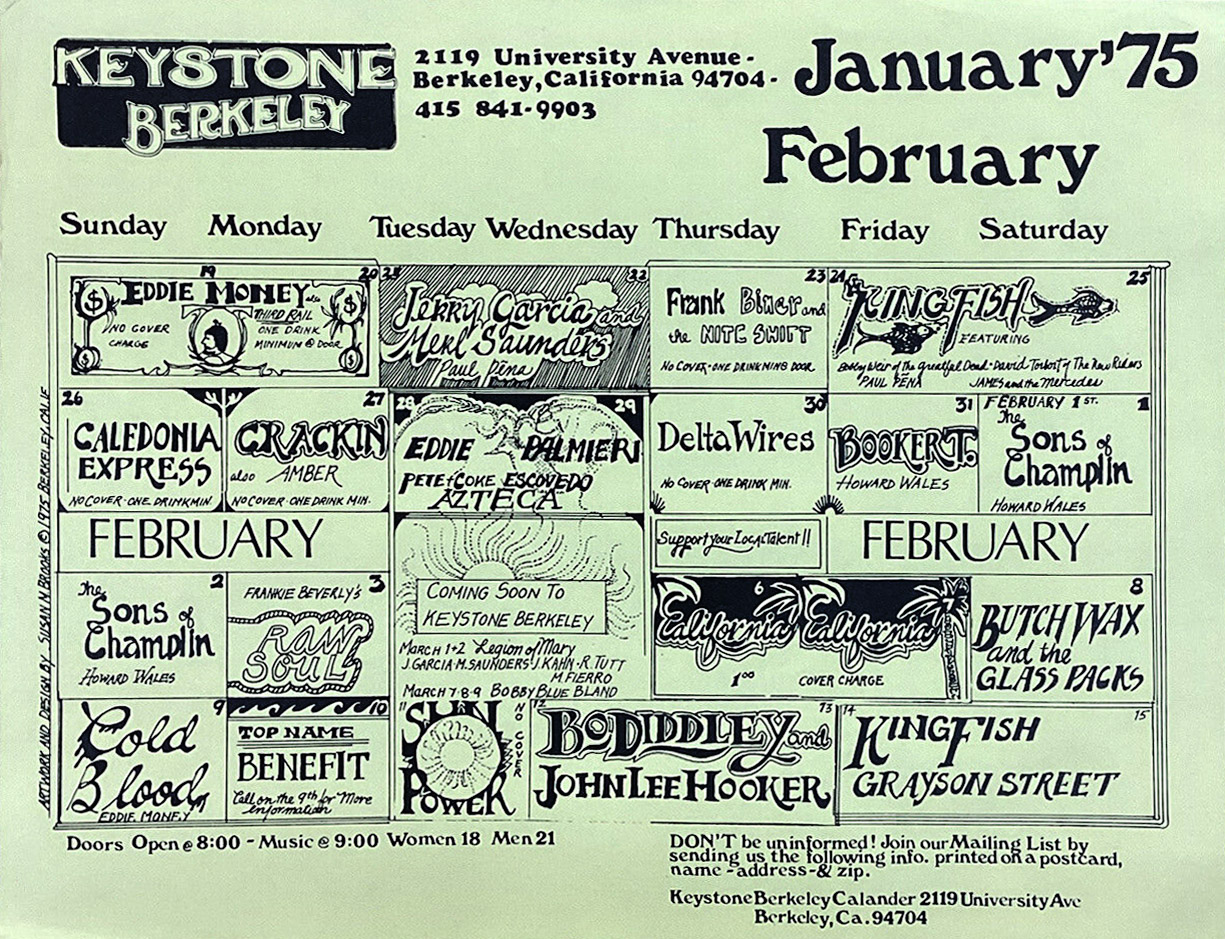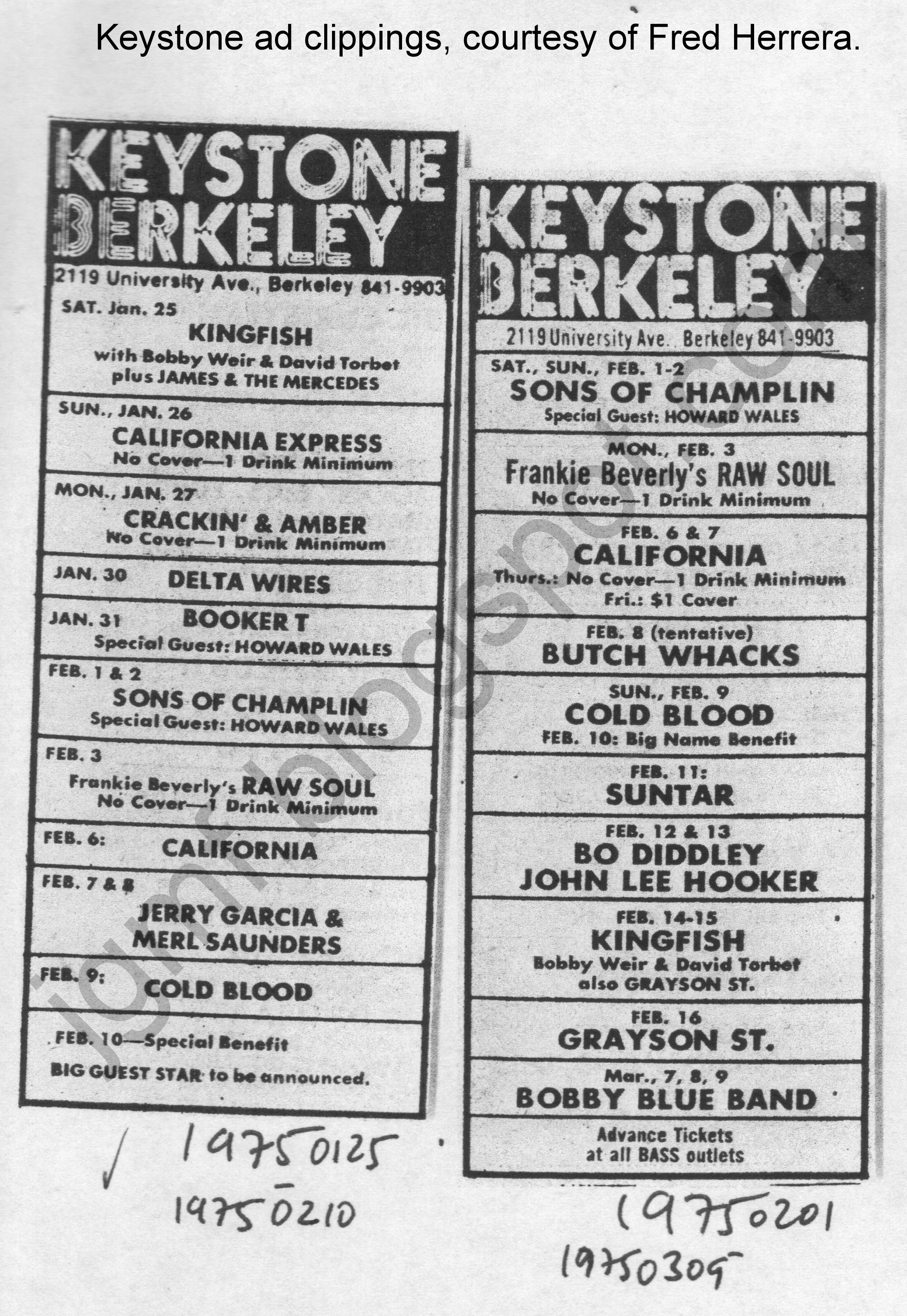Billings as "Jerry Garcia and Merl Saunders", but consecutive weeks' advertisements from Fred Herrera's clippings (the Fred Files) show a change, with California extended to Feb. 6 and 7 and Butch Whacks listed as tentative for Feb. 8 in the calendar starting with 2/1/75.
