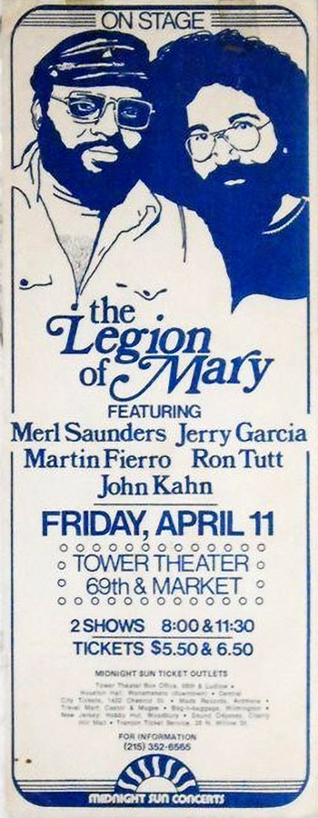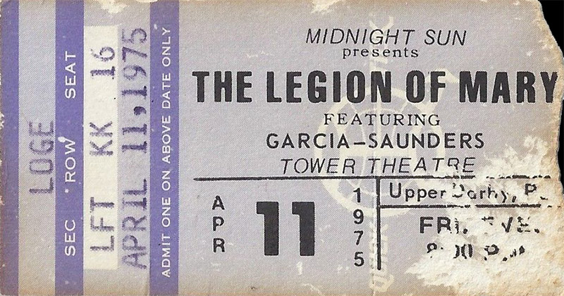 preview: "Legion of Mary in county Friday," Daily Times (Delaware County, PA), April 8, 1975, p. 12: "The Legion of Mary (formerly Garcia-Saunders and Friends), will appear at 8 p.m and 11:30 p.m. Friday at the Tower Theater, 69th and Market Sts., Upper Darby. Composed of five members, the group includes Jerry Garcia, Merl Saunders, Ron Tutt, drummer for Elvis Presley and Cat Stevens, and bassist John Kahn, formerly of Maria Muldaur's band."
