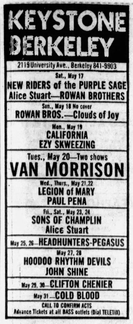 mention: San Francisco Examiner, May 16, 1975, p. 39; listing: "Country Joe McDonald Back In Area," Independent-Journal [San Rafael, CA], May 16, 1975, p. 21