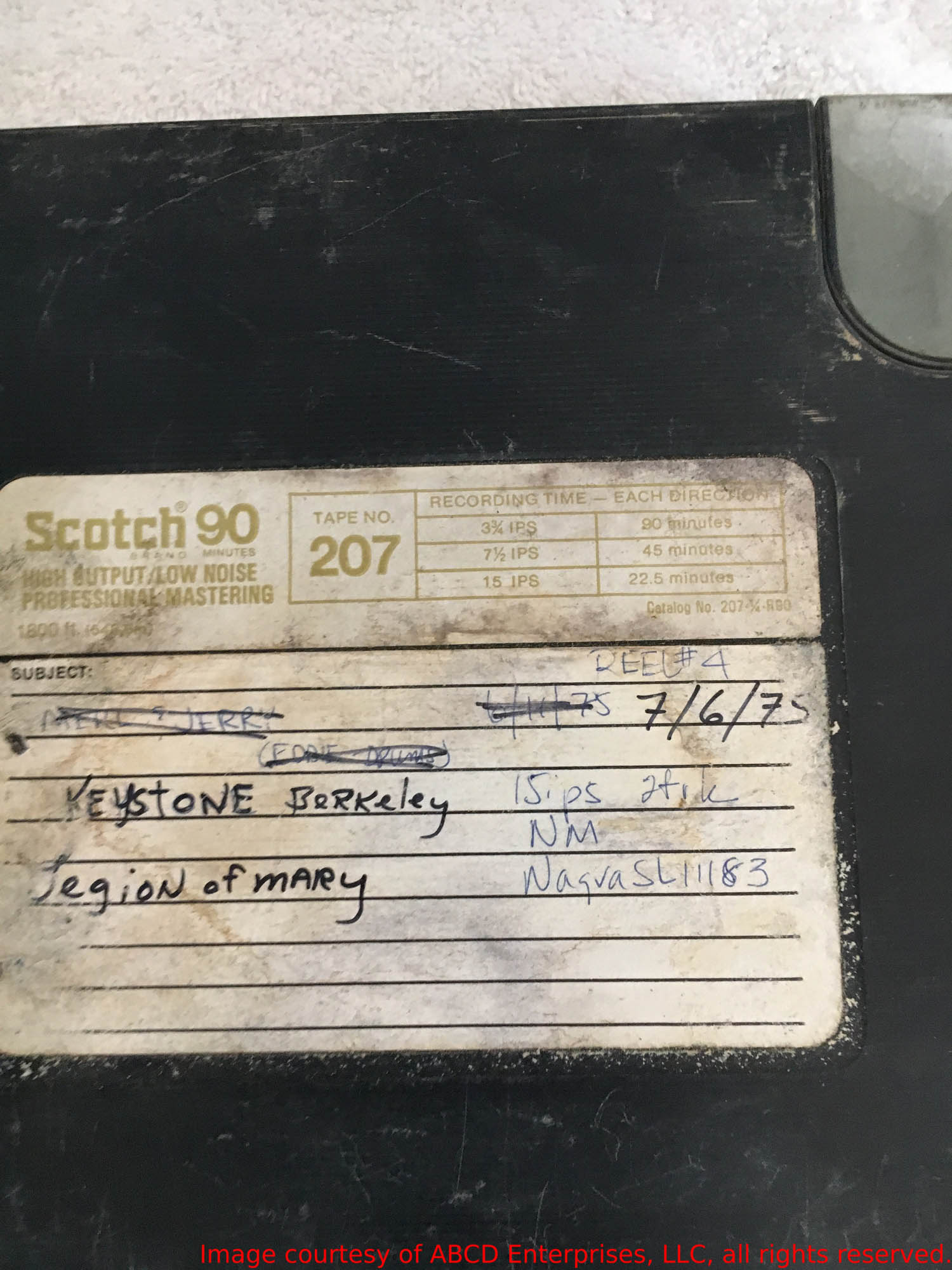 Sue: band takes $500 or 80% total gross door receipts. Contract names "Merl Saunders, Jerry Garcia & Friends". Tutt had finished Elvis tour in Memphis the night before and we have long guessed he didn't play this show (because they used JGMS rather than LOM band name). Then a fragment of evidence appeared: One of Rex Jackson and Betty Cantor-Jackson's Legion of Mary 7/6/75 reels was in this box, with scratched out notation reading "Merl & Jerry (Eddie - drums), 6/11/75 reel #4, 15ips 2 trk NM Nagra SL11183". We thought it might be Merl's cousin Eddie Moore and were dissuaded of that somehow. But now that we know he played 6/8/75, we are updating our priors to strong confidence that he played this night as well.